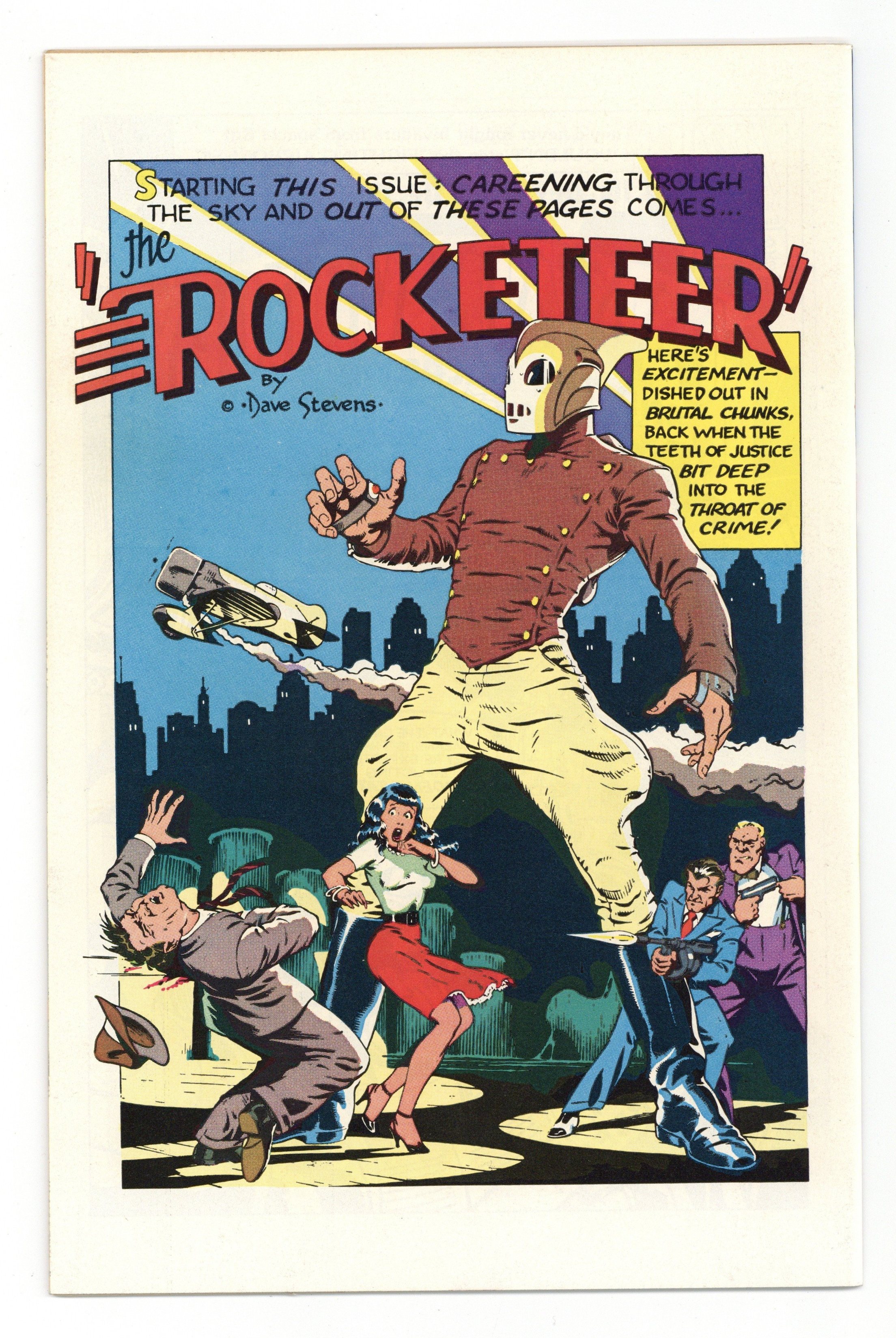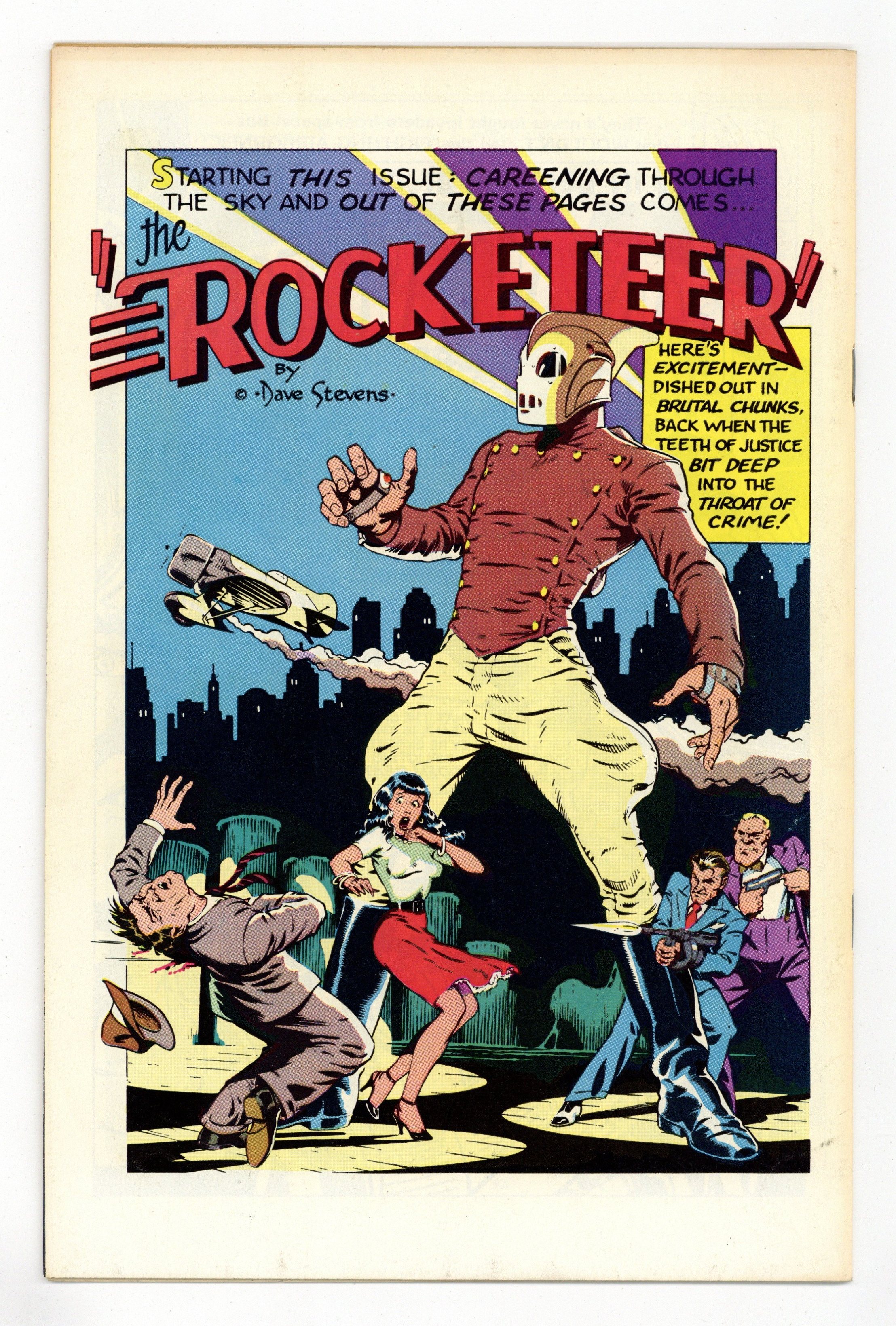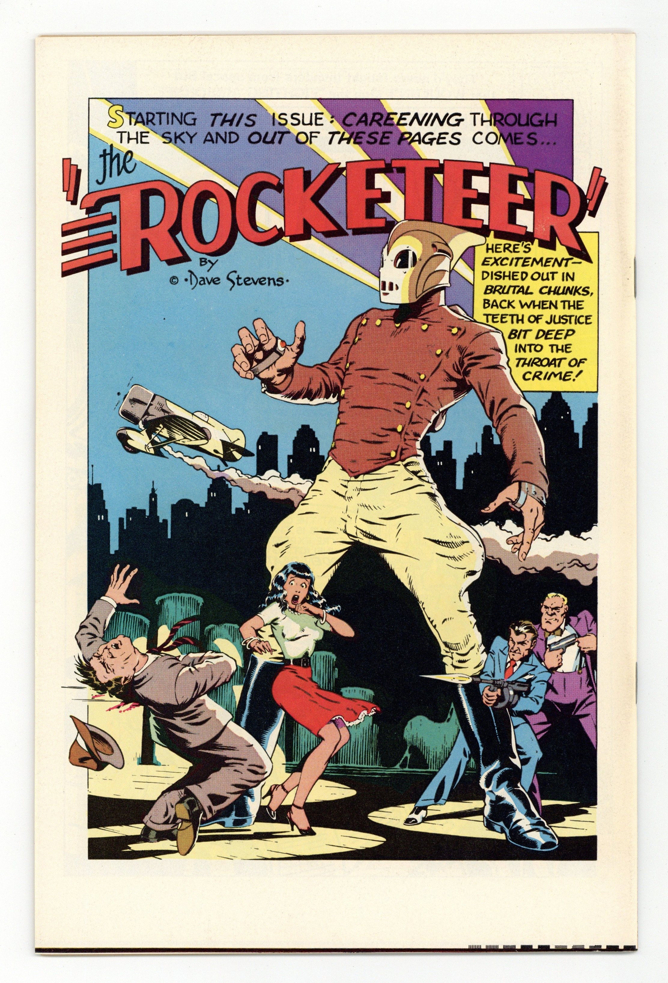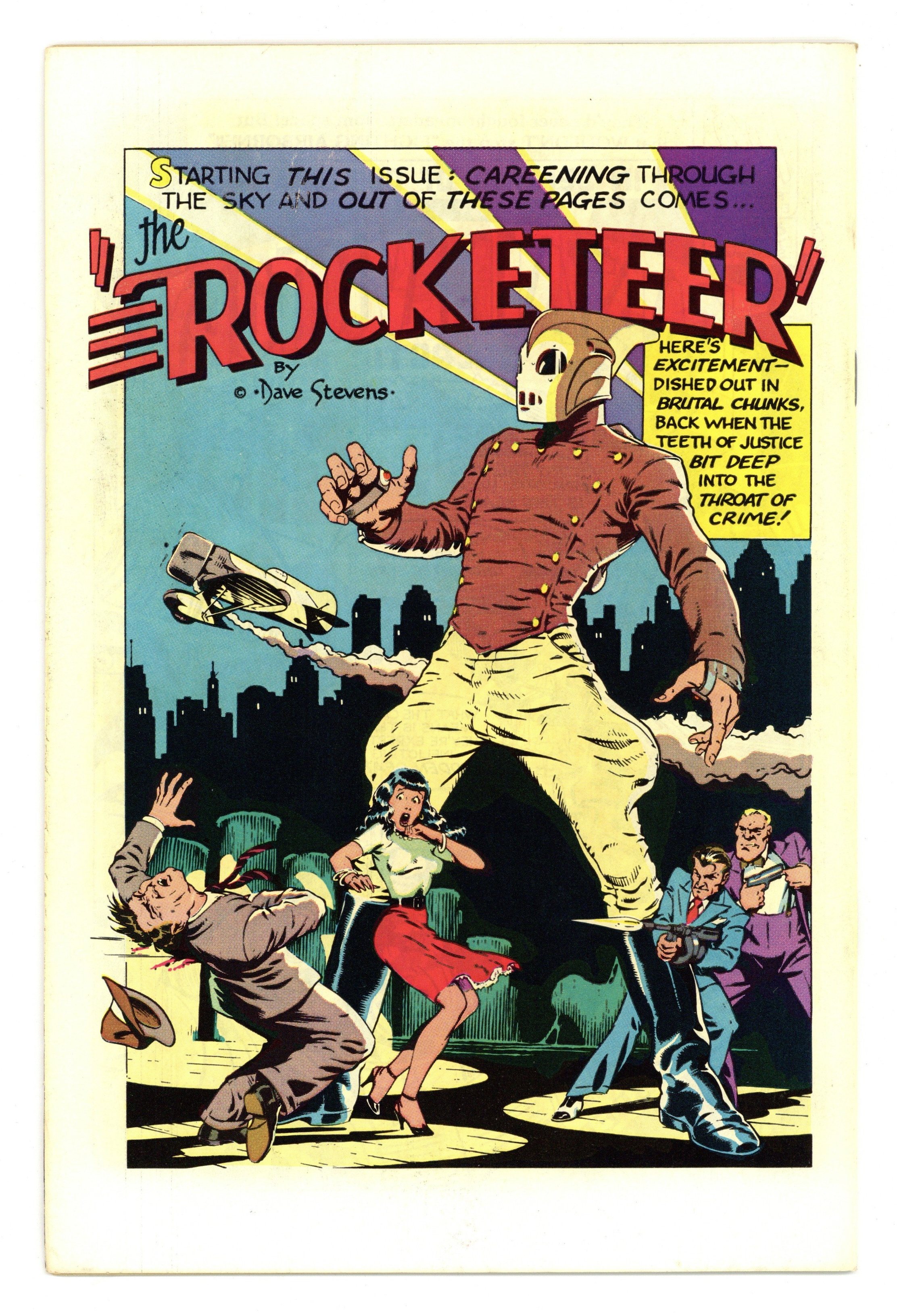 First appearance of the Rocketeer. Torin finds himself transported from 43 A.D. to the 22nd year of the new millennium. Why is he there? The galaxy is in danger and in need of his help in finding some lost amulets which contain great sources of power in an untitled story. Script and art by Mike Grell. Issue also has the Rocketeer with script and art by Dave Stevens. Cover price $1.00.