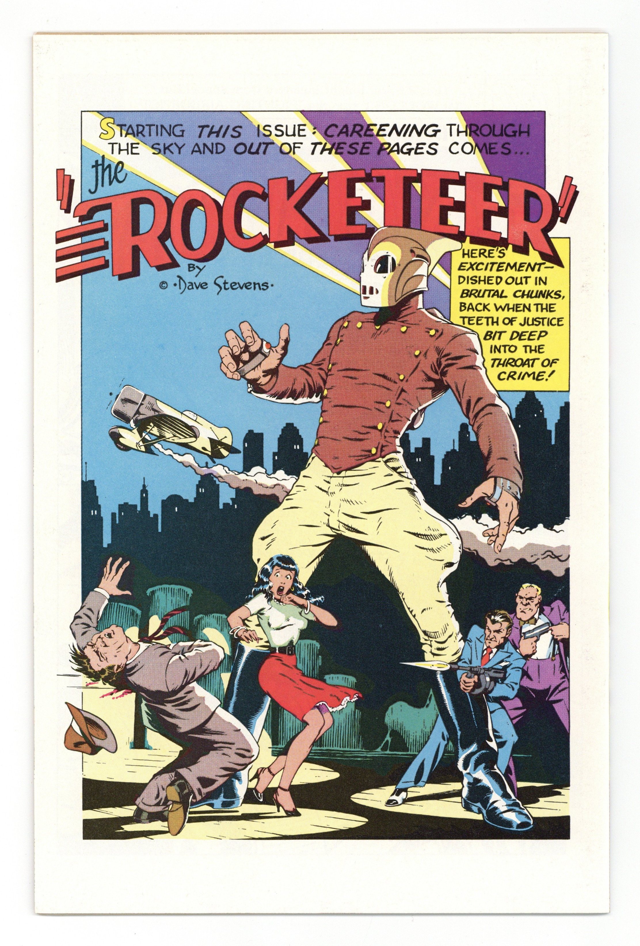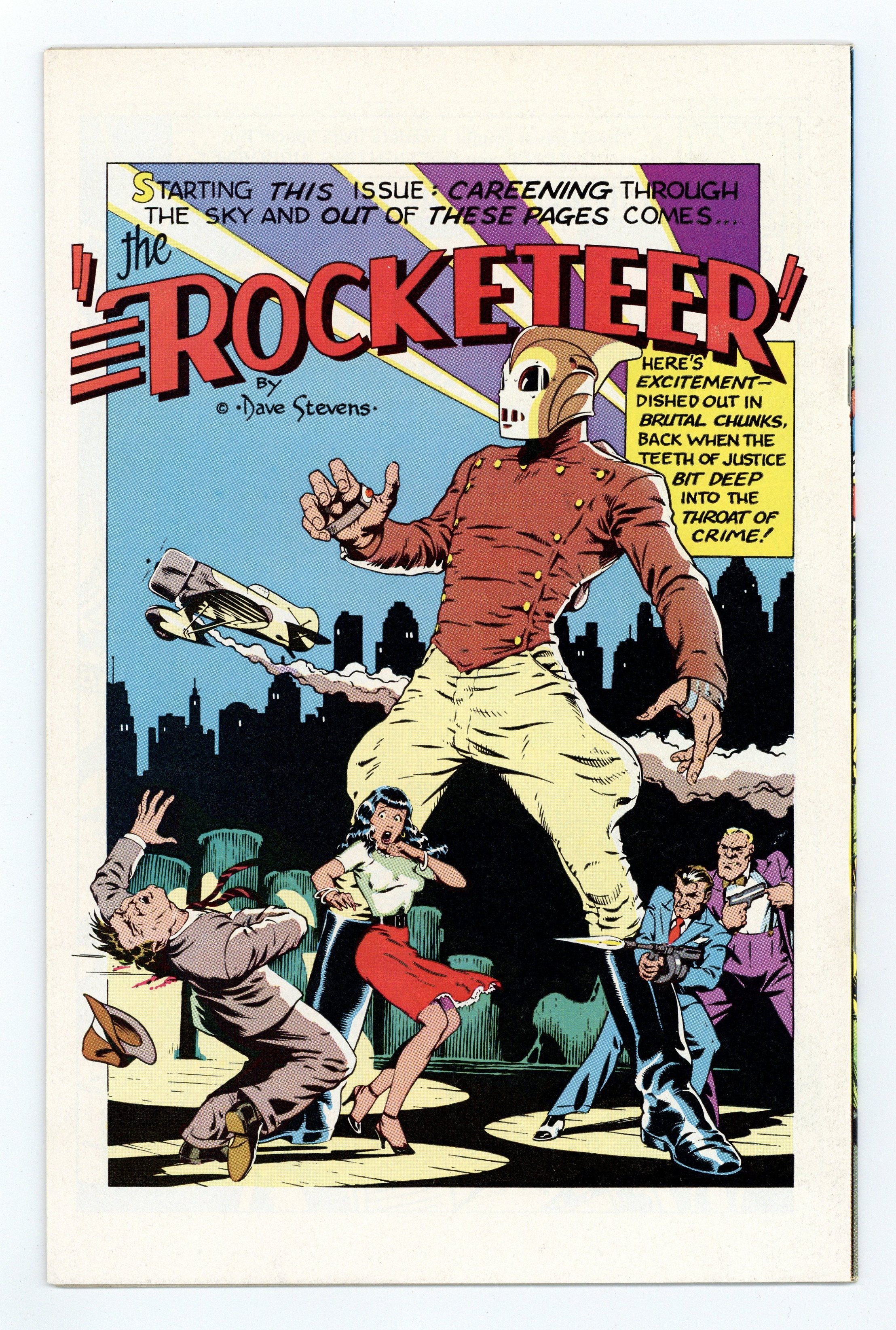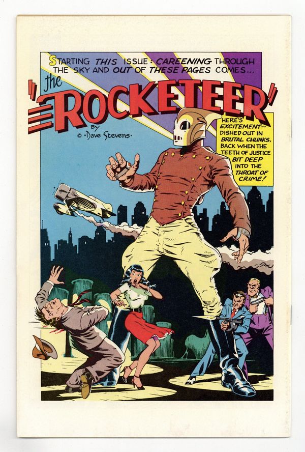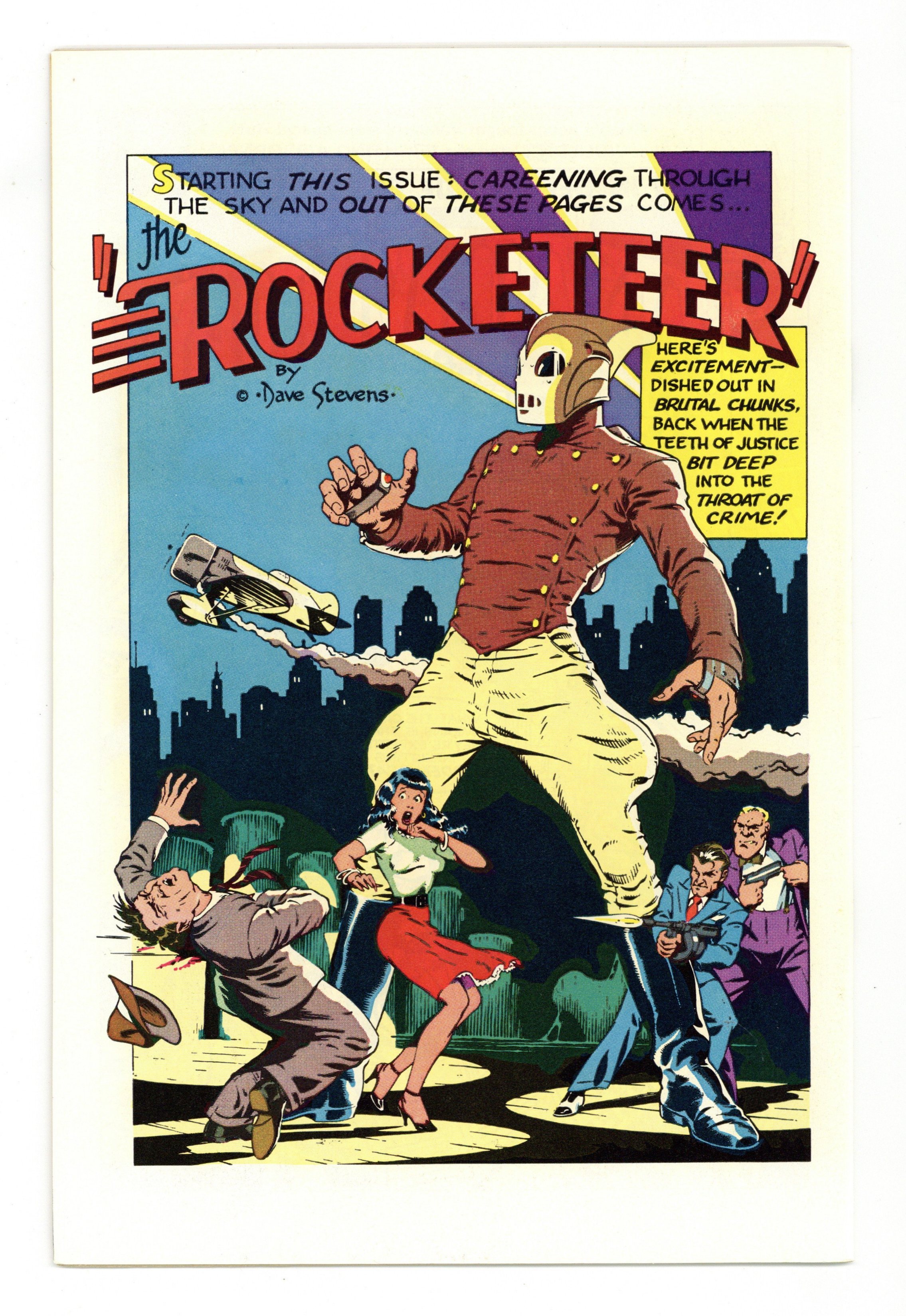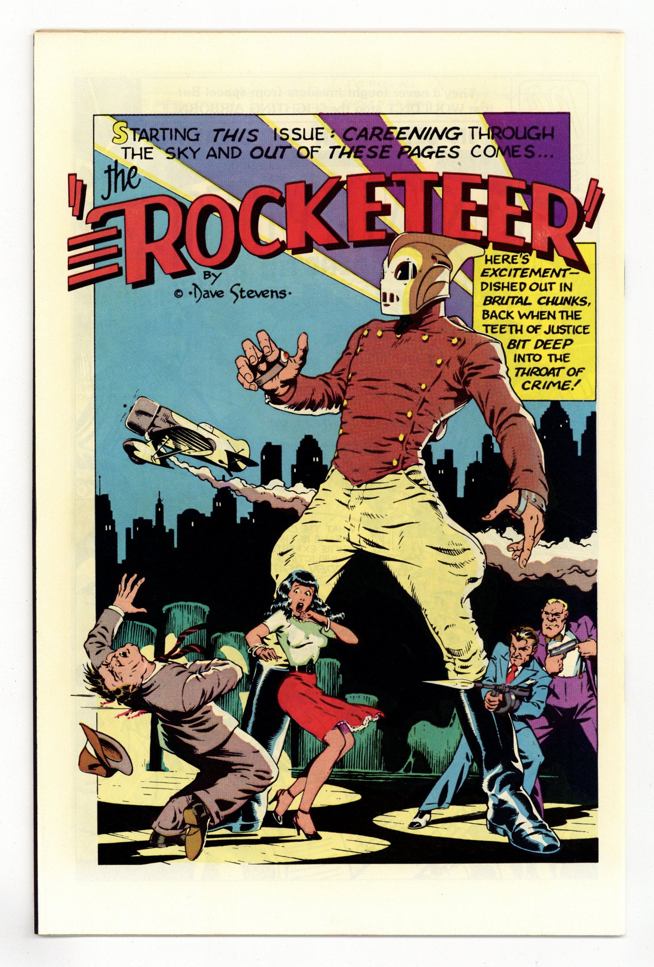 First appearance of the Rocketeer. Torin finds himself transported from 43 A.D. to the 22nd year of the new millennium. Why is he there? The galaxy is in danger and in need of his help in finding some lost amulets which contain great sources of power in an untitled story. Script and art by Mike Grell. Issue also has the Rocketeer with script and art by Dave Stevens. Cover price $1.00.