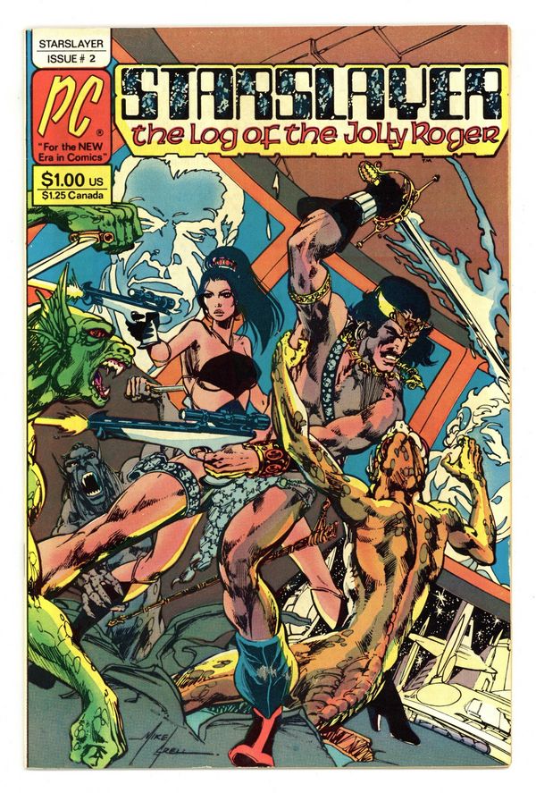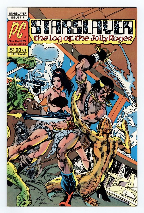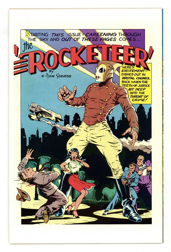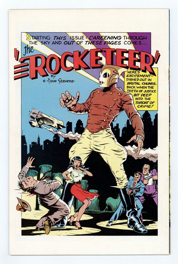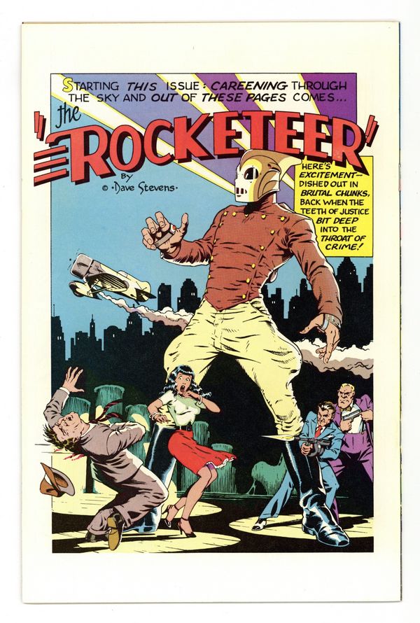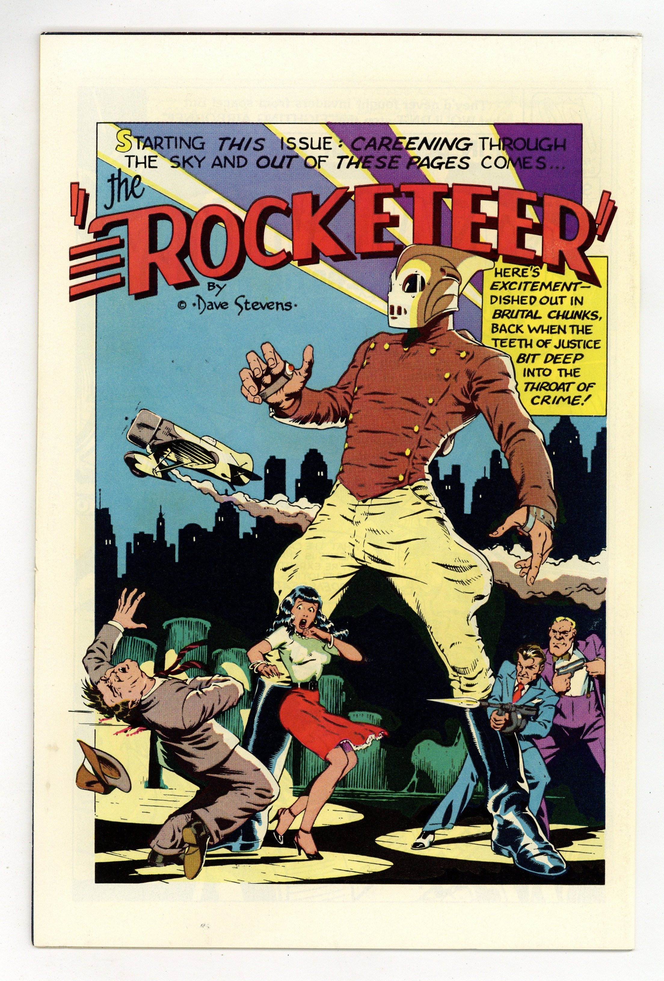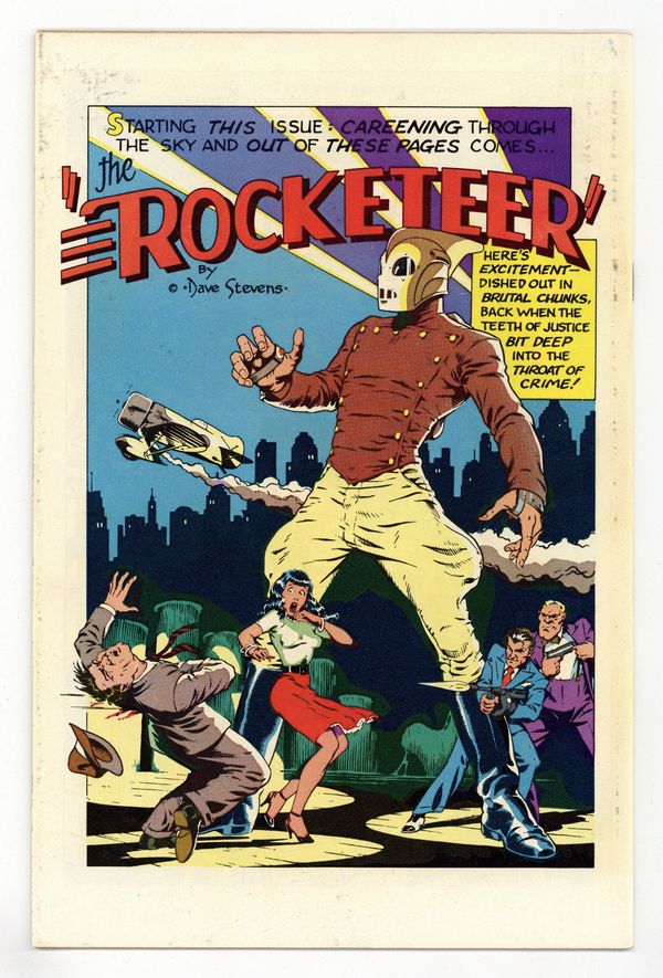 First appearance of the Rocketeer. Torin finds himself transported from 43 A.D. to the 22nd year of the new millennium. Why is he there? The galaxy is in danger and in need of his help in finding some lost amulets which contain great sources of power in an untitled story. Script and art by Mike Grell. Issue also has the Rocketeer with script and art by Dave Stevens. Cover price $1.00.