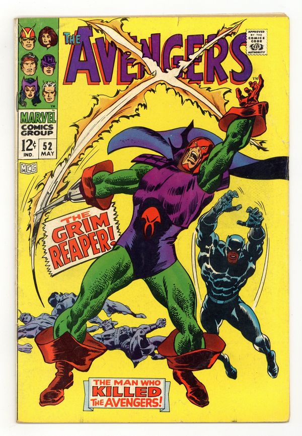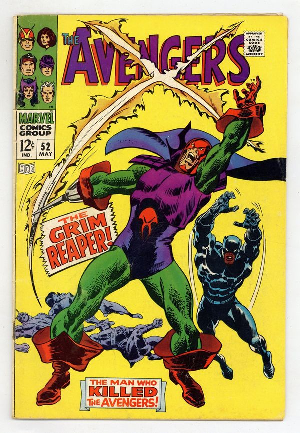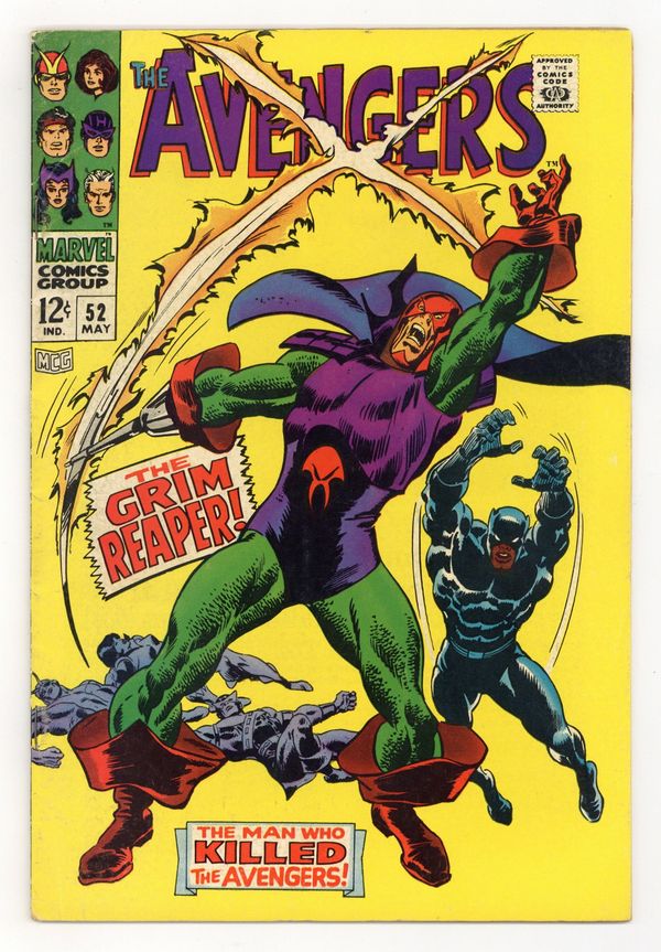 First appearance of the Grim Reaper in "Death Calls for the Arch-Heroes!" Script by Roy Thomas. Pencils by John Buscema. Inks by Vince Colletta. Cover by John Buscema. The Black Panther arrives at Avengers Mansion ready to join Earth's Mightiest Heroes! However when T'Challa reaches the main meeting room, he finds his three would-be teammates lying on the floor unconscious! The panther begins to render first aid, but Jasper Sitwell suddenly appears and arrests him for murder! While being transported to and questioned at the local police station, T'Challa puts the evening's strange pieces together! And the newest avenger rushes back to the mansion to face the true perpetrator! Wow, the Black Panther vs. the Grim Reaper! What a debut for the superhero and the super-villain! Cameo appearances by the Black Widow, Tony Stark, Captain America, and Thor. Flashback cameo by Wonder Man to recap the events of Avengers #9. Avengers Lineup: Black Panther, Goliath, Hawkeye, and the Wasp. (Notes: The Grim Reaper (aka Eric Williams) returns in Avengers #78 to continue his quest for revenge. The letters page includes a letter from comics writer Mike Uslan. This issue was reprinted in Marvel Triple Action #44.) 36 pages. Cover price $0.12.