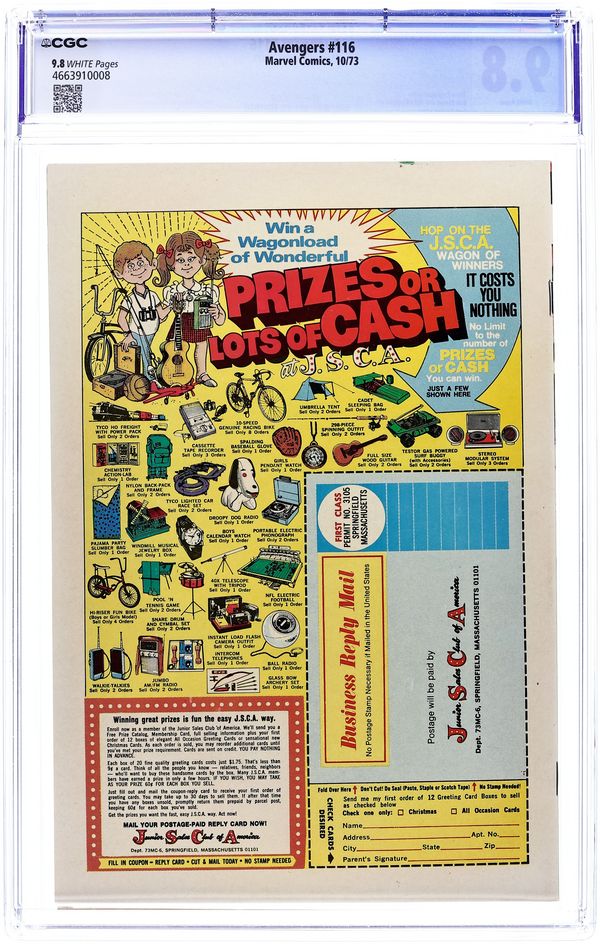 "Betrayal!" Avengers-Defenders crossover. Part 3 of 8. Guest-starring the Defenders. Script by Steve Englehart. Pencils by Bob Brown. Inks by Mike Esposito. Cover by John Romita and Mike Esposito. Story continues from Defenders 8. Earth's Mightiest Heroes visit Dr. Strange's townhouse in Greenwich Village and request permission to enter, but Wong slams the door in their faces! After an angry Thor breaks down the door, the Avengers storm inside, but a mystic spell sweeps them back out onto the street! Meanwhile gathered around the Orb of Agamotto, the Defenders put together a plan to find the six pieces of the Evil Eye. However, in the dark realm, Loki has grown suspicious of his dreadful ally! And contacts the Avengers to tell them about the Defenders' search for the ancient instrument from Avalon! So the die is cast! And the blockbuster battles are about to begin! Flashback cameos by Prester John, Wyatt Wingfoot, and the Human Torch to recap the history of the Evil Eye. Next Chapter: "The Silver Surfer vs. the Vision and the Scarlet Witch" The Avengers-Defenders Clash kicks into high gear as members of both teams span the globe to searching for the Evil Eye! And the first showdown features two of the most popular Marvel super-heroes of the 1970's! The Silver Surfer arrives in French Polynesia and plunges into the island's indigenous volcano to look for the Evil Eye. But the cosmic sky-rider's probing triggers a volcanic eruption! The fiery blast knocks a passing quinjet out of the sky and nearly kills the Scarlet Witch! Needless to say, this act enrages the synthezoid avenger! And in the heart of the raging volcano, the Vision and the Silver Surfer fight for the Evil Eye! Story continues in Defenders 9. (Notes: The Evil Eye previously appeared in Fantastic Four 54. This issue includes a full-page survey for readers to complete and mail back to the Marvel bullpen. A reprint edition exists for this issue.) 36 pgs. Cover price $0.20.