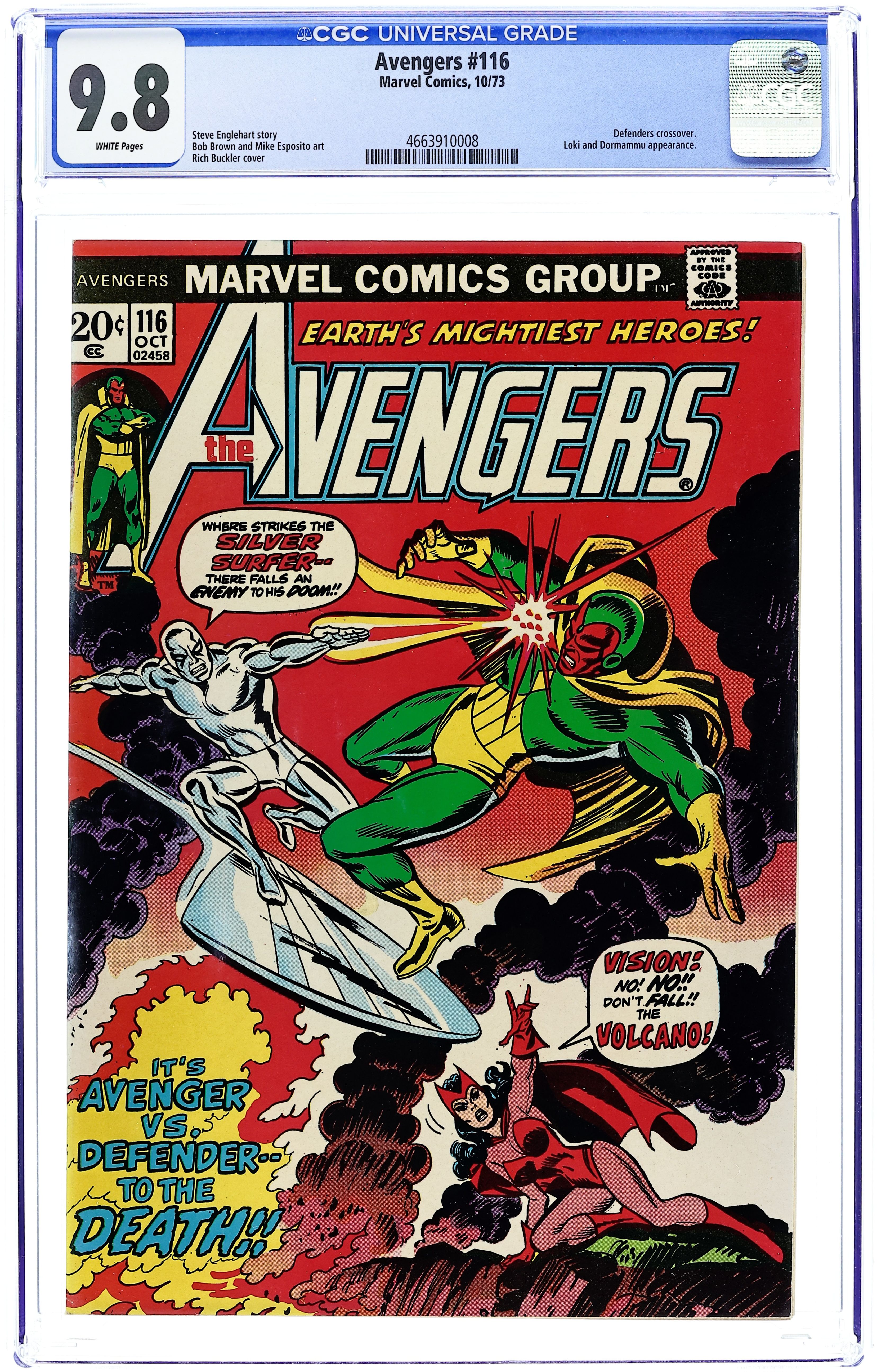Tags: Avengers/Defenders War (part 3), Marvel Legacy Numbering: Avengers (part 116)$25.50"Betrayal!" Avengers-Defenders crossover. Part 3 of 8. Guest-starring the Defenders. Script by Steve Englehart. Pencils by Bob Brown. Inks by Mike Esposito. Cover by John Romita and Mike Esposito. Story continues from Defenders 8. Earth's Mightiest Heroes visit Dr. Strange's townhouse in Greenwich Village and request permission to enter, but Wong slams the door in their faces! After an angry Thor breaks down the door, the Avengers storm inside, but a mystic spell sweeps them back out onto the street! Meanwhile gathered around the Orb of Agamotto, the Defenders put together a plan to find the six pieces of the Evil Eye. However, in the dark realm, Loki has grown suspicious of his dreadful ally! And contacts the Avengers to tell them about the Defenders' search for the ancient instrument from Avalon! So the die is cast! And the blockbuster battles are about to begin! Flashback cameos by Prester John, Wyatt Wingfoot, and the Human Torch to recap the history of the Evil Eye. Next Chapter: "The Silver Surfer vs. the Vision and the Scarlet Witch" The Avengers-Defenders Clash kicks into high gear as members of both teams span the globe to searching for the Evil Eye! And the first showdown features two of the most popular Marvel super-heroes of the 1970's! The Silver Surfer arrives in French Polynesia and plunges into the island's indigenous volcano to look for the Evil Eye. But the cosmic sky-rider's probing triggers a volcanic eruption! The fiery blast knocks a passing quinjet out of the sky and nearly kills the Scarlet Witch! Needless to say, this act enrages the synthezoid avenger! And in the heart of the raging volcano, the Vision and the Silver Surfer fight for the Evil Eye! Story continues in Defenders 9. (Notes: The Evil Eye previously appeared in Fantastic Four 54. This issue includes a full-page survey for readers to complete and mail back to the Marvel bullpen. A reprint edition exists for this issue.) 36 pgs. Cover price $0.20.
