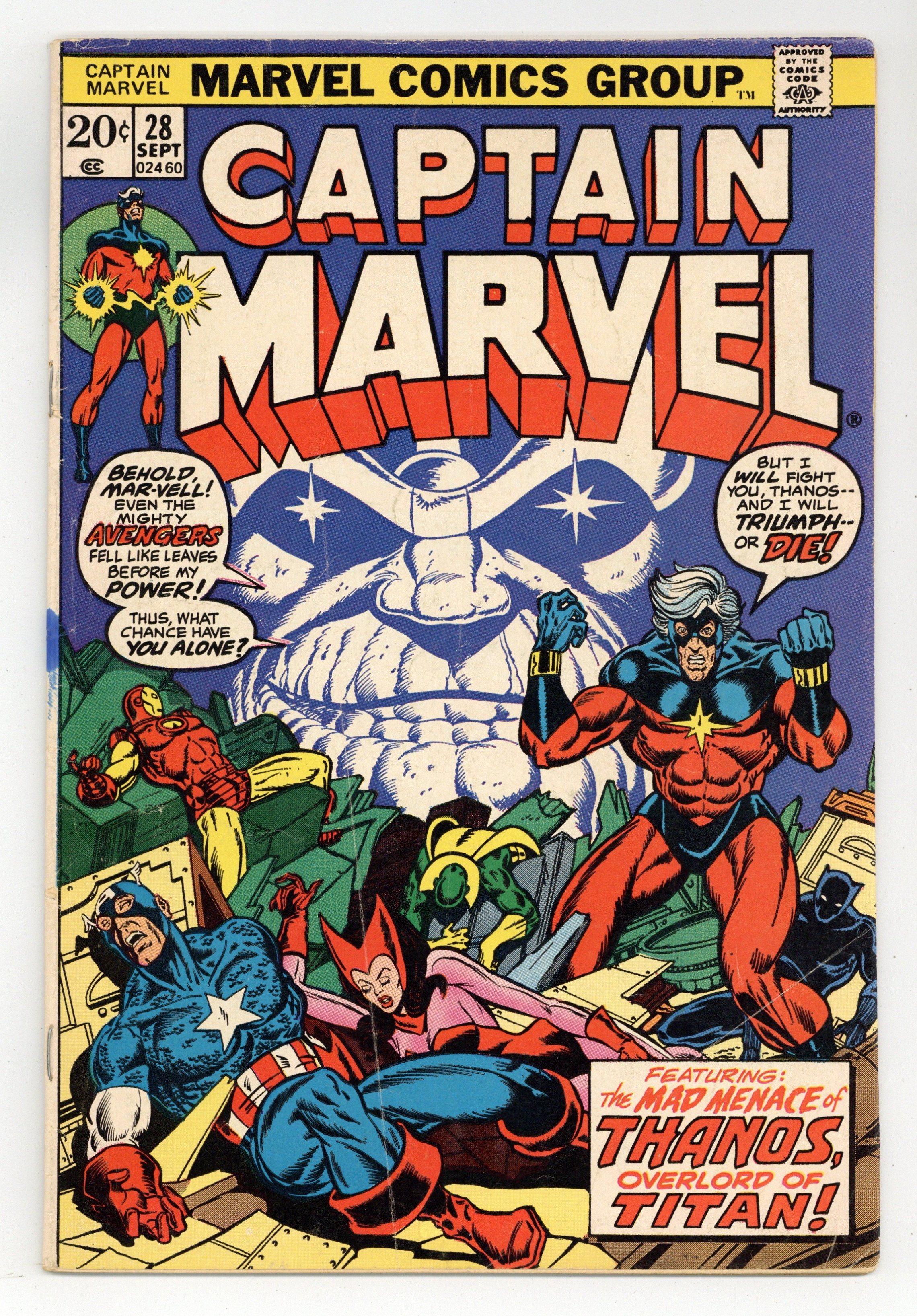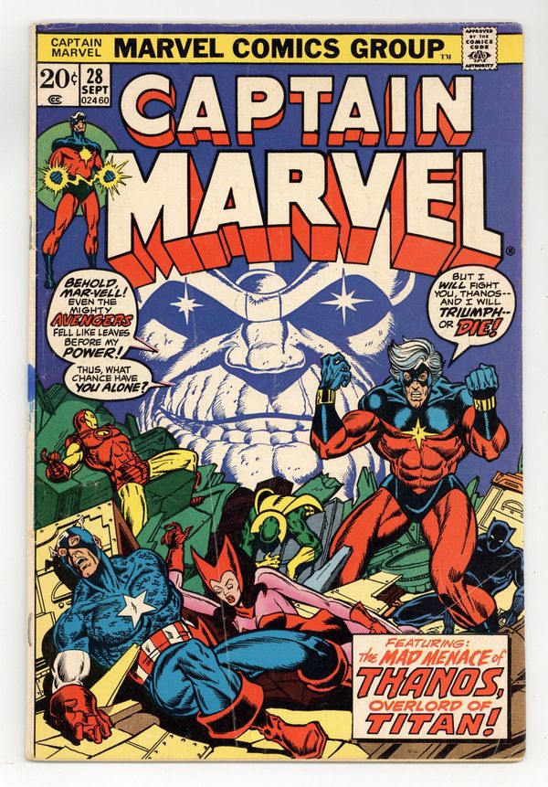 Thanos defeats Drax the Destroyer and obtains the Cosmic Cube--and that can't be a good thing! The Avengers (Captain America, Iron Man, the Scarlet Witch, the Vision, and the Black Panther) guest star in "When Titans Collide!" Plot, pencils, and script (chapter 2) by Jim Starlin, script (chapters 1 and 3) by Mike Friedrich, inks by Dan Green. (Splash page art retouches by John Romita Sr.). Captain Marvel battles the Controller. Drax the Destroyer appearance. Starlin cover pencils. Cover price $0.20.