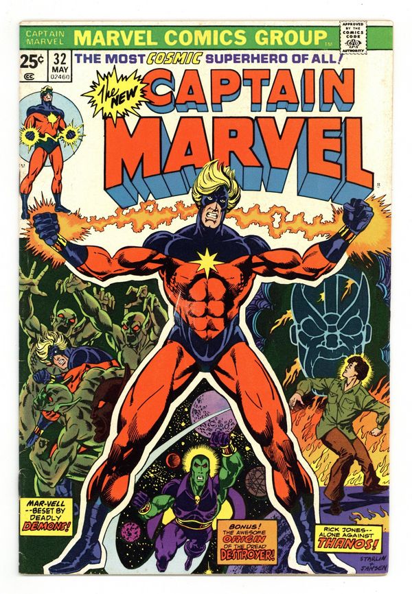 "Thanos the Insane God!" Guest-starring Iron Man. Origin of Drax the Destroyer. Script by Jim Starlin and Mike Friedrich (writing assist). Pencils by Jim Starlin. Inks by Dan Green. Cover by Jim Starlin and Klaus Janson. Incredibly the powerful Thanos has ascended to godhood! But the awesome battle rages on! While Captain Marvel and Iron Man fight Thanos' minions on Titan, the enraged Drax the Destroyer attacks Thanos in outer space! Thanos the man was already difficult to beat. What chance is there against Thanos the god? Meanwhile, the mad Titan's alien armada zooms towards Earth! But the Mighty Avengers are ready and waiting for their close encounter with Thanos' kind! Story continues in Avengers 125. Cameo appearances by the Avengers, Death, ISAAC, Lou-Ann Savannah, Rick Jones, Mentor, Moondragon, and Eros. First 25¢ issue. (Notes: The letters page includes a half-page map of Titan. The letters page also contains Marvel Value Stamp series A #19 Hogun, Balder, and Fandral.) 32 pages Cover price $0.25.