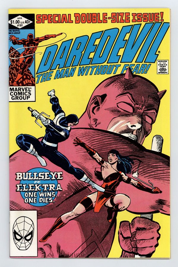 Direct Edition. Cover pencils by Frank Miller, inks by Klaus Janson. Last Hand, script by Frank Miller, pencils by Frank Miller (breakdowns) and Klaus Janson (finished art), inks by Klaus Janson; Bullseye breaks out of prison; Elektra hunts down Foggy and is about to kill him until she recognizes him as Matt's buddy from college; Bullseye fights Elektra and kills her with her own sai; DD goes after Bullseye and ends up dropping him from a great height, breaking every bone in his body; Kingpin appearance; story narrated by Bullseye; story dedicated to the memory of Wally Wood 1927-1981. Full page pin-up ad for Marvel Fanfare, art by Michael Golden. Statement of Ownership average # of copies in preceding 12 months: 276,812 Cover price $1.00.