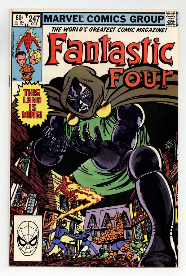 Direct Edition. "This Land is Mine!" Part 2 of 2. Script and Art by John Byrne. Cover by John Byrne. Since losing the throne of Latveria in Fantastic Four 200, Doctor Doom has been driven by one thing...getting it back! Now the deposed monarch has enlisted the FF (via his inhibitor ray) to help him regain his country! When Reed, Sue, Ben, and Johnny arrive in Latveria, they are shocked by the deplorable condition of the capital. Could Doctor Doom actually be the solution to Latveria's problems? Victor Von Doom and Zorba will battle to death for control of Latveria! First appearance of Kristoff. (Note: The letters page includes a joint letter from comics creators Richard Pini and Wendy Pini.) 36 pages Cover price $0.60.