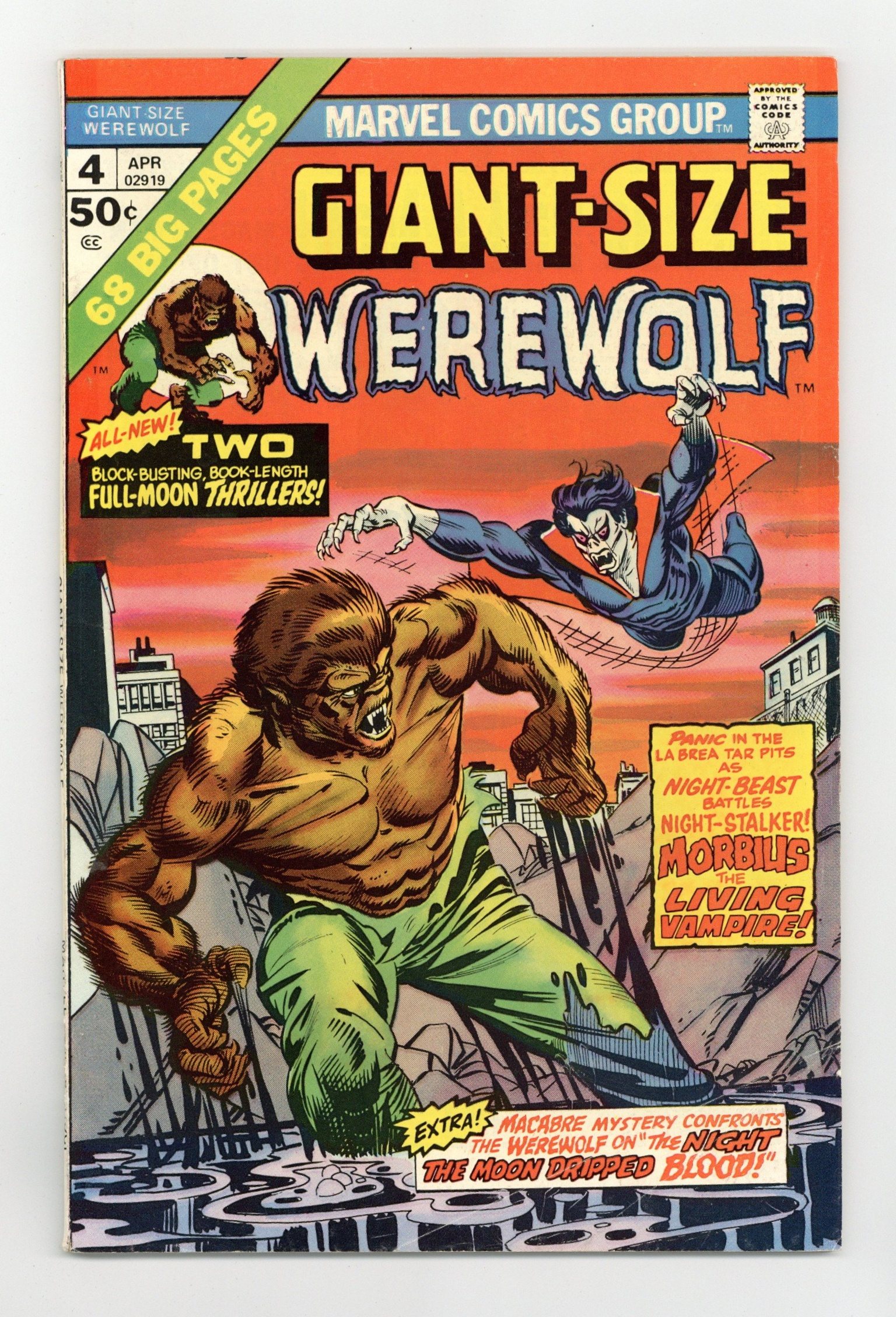 Cover pencils by Gil Kane. "A Meeting of Blood," script by Doug Moench, art by Virgil Redondo; Under the full moon, Jack Russell transforms into the Werewolf and roams the streets of Los Angeles, while blocks away, Morbius the Living Vampire glides silently on the trail of Martine Bancroft, his one-time fiancé; He speaks to her from a rooftop, but she doesn't at first remember him; Recounting his origin, Morbius breaks through her fog-shrouded memory, and she calls him down to embrace him. "When the Moon Dripped Blood!", script by Doug Moench, art by Yong Montano; Jack Russell receives a surprise visit at his step-father's home from his actress friend, Clary Winter; She tells him their friend Buck Cowan has sold a movie script to Brad Wrangle; The studio stunt-coordinator wants to move into production, and has hired Clary to star, as well as wanting Jack to perform stunt-work. "The Return of the Brain" (reprinted from Adventures into Terror #6) starring The Brain, Gilda Spears, and Steve Manners, art by Russ Heath. Letter to the editor from publisher Dean Mullaney. 68 pgs., full color. Cover price $0.50.