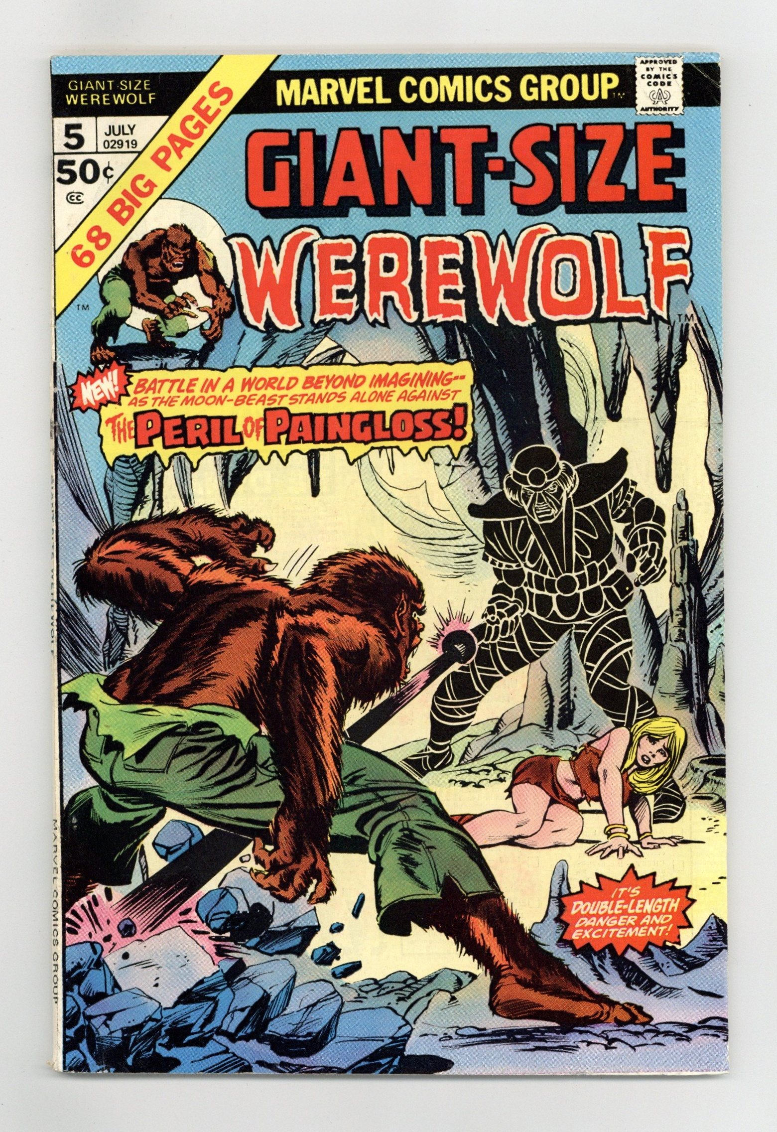 Cover pencils by Gil Kane, inks by Tom Palmer. "The Plunder of Paingloss," script by Doug Moench, art by Yong Montano; Under the pretense of conducting an interview for a newspaper, Jack Russell and Buck Cowan visit Satanist High Priest Joaquin Zairre, hoping to learn of a cure for lycanthropy; Zairre sees through the ruse, sensing that Jack is the cursed one; When Jack and Paingloss reach the barrier and the throne, they are met by Grithstane who casts a spell to keep Jack cogent and docile when they cross to the Shadow-Realm. Captain Marvel stars in the Hostess Twinkies ad, "The Big Bang!!" "The Most Miserable Man In the World!" (reprinted from Mystic #16); A man with terrible luck finally uses a book of black magic to summon the Devil, who informs him that he actually is in Hell. "He's Coming to Get Me!" (reprinted from World of Fantasy #11), art by Ted Galindo; A man who cheated his brother out of their father's money gets a letter stating that his brother is "coming to get him"; He puts a gun under his jacket since he thinks his brother is out for revenge. "The Unsolid Man" (reprinted from World of Fantasy #13), script by Carl Wessler, art by Joe Orlando; A Communist agitator flees the authorities on a rocket sled that is so fast it outdistances time and briefly allows him to him to walk through walls until time catches up with him. 68 pgs., full color. Cover price $0.50.