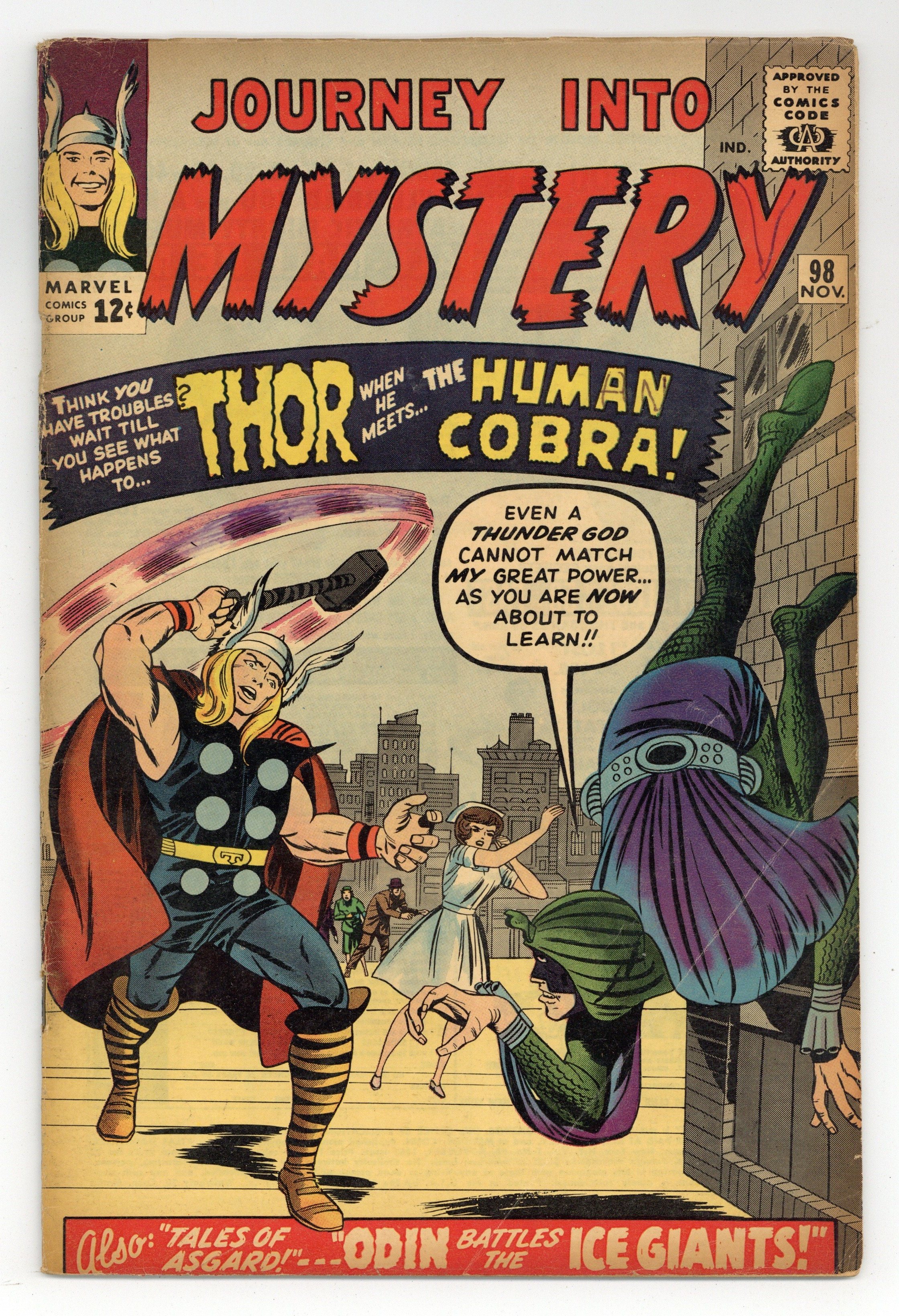 Cover pencils by Jack Kirby, inks by Sol Brodsky. First appearance of the Cobra in "Challenged by the Human Cobra!", script by Stan Lee, art by Don Heck; While visiting India, Don Blake finds that one of his old teachers has been murdered by a villain who gained the power of a snake; Odin and Jane Foster appearances. "Snowstorm" two-page text story. "The Purple Planet," script by Stan Lee (plot) and Larry Lieber (script), pencils by Larry Lieber, inks by Matt Fox; A criminal in the future travels to a rich but primitive world, hoping to exploit the simple people. Second "Tales of Asgard" installment, "Odin Battles Ymir, King of the Ice Giants," script by Stan Lee, pencils by Jack Kirby, inks by Don Heck; The ice giants, led by Ymir, attack Asgard but Odin defends it and traps Ymir inside a ring of fire. 36 pgs., full color. $0.12. Cover price $0.12.