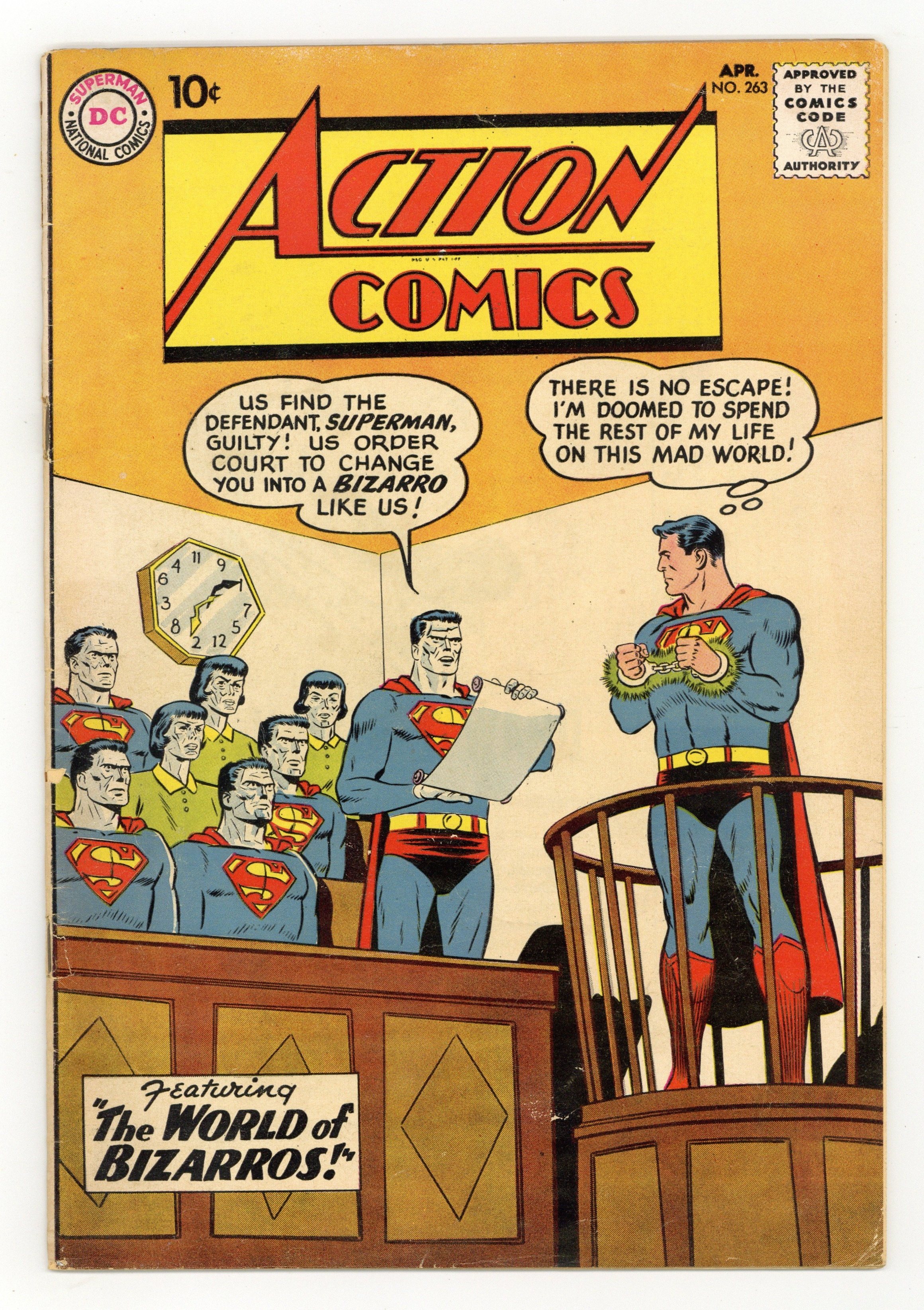 Cover pencils by Curt Swan, inks by Stan Kaye. "The World of Bizarros!", script by Otto Binder, pencils by Wayne Boring, inks by Stan Kaye; Bizarro and Bizarro-Lois move to another world which Bizarro populates with a duplicator ray; Superman visits and discovers Bizarros do everything backwards; Superman is sent to prison for violating the Bizarro code. 2/3-page Little Pete story by Henry Boltinoff. "Supergirl's Darkest Day!", script by Otto Binder, art by Jim Mooney; Supergirl rescues a boy with amnesia found lost at sea; He stays at the orphanage until Linda can figure out where he's really from. 36 Pages, Full Color. $.10 Cover price $0.10.