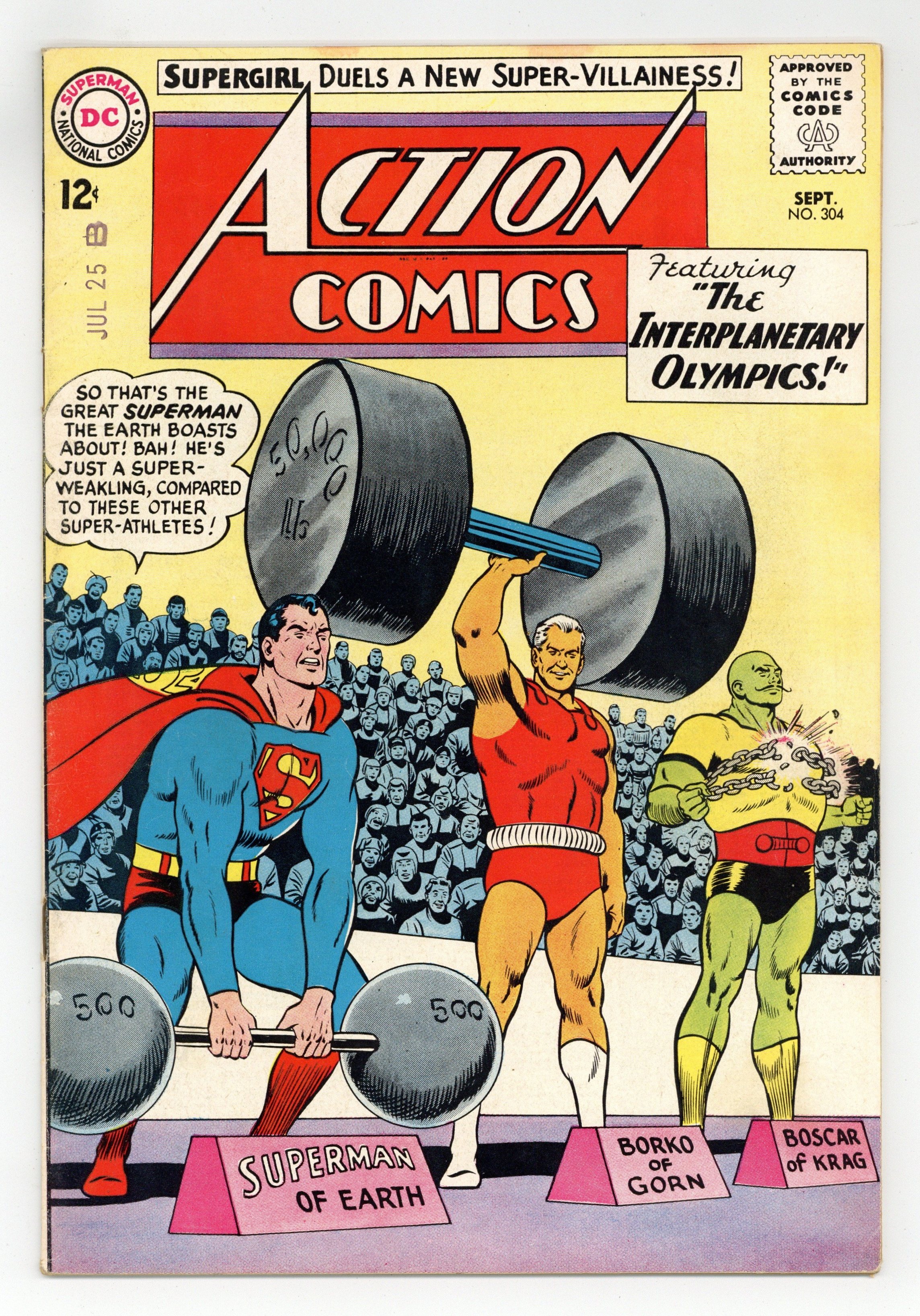 Cover pencils by Curt Swan, inks by Sheldon Moldoff. "The Interplanetary Olympics!", script by Leo Dorfman, pencils by Curt Swan, inks by George Klein; Superman and Lana are taken to the planet Vorn, where Superman is invited to compete in the Interplanetary Olympics. Supermen of America ad. One-page Shorty story by Henry Boltinoff. Origin & 1st appearance of Black Flame in "The Maid of Menace!", script by Leo Dorfman, art by Jim Mooney; Black Flame, a super-powered villainess, tells Supergirl she is her descendant from the 40th century, but Supergirl eventually deduces that she is really from Kandor, and wipes out her powers with Gold Kryptonite. 36 Pages, Full Color. $0.12 Cover price $0.12.