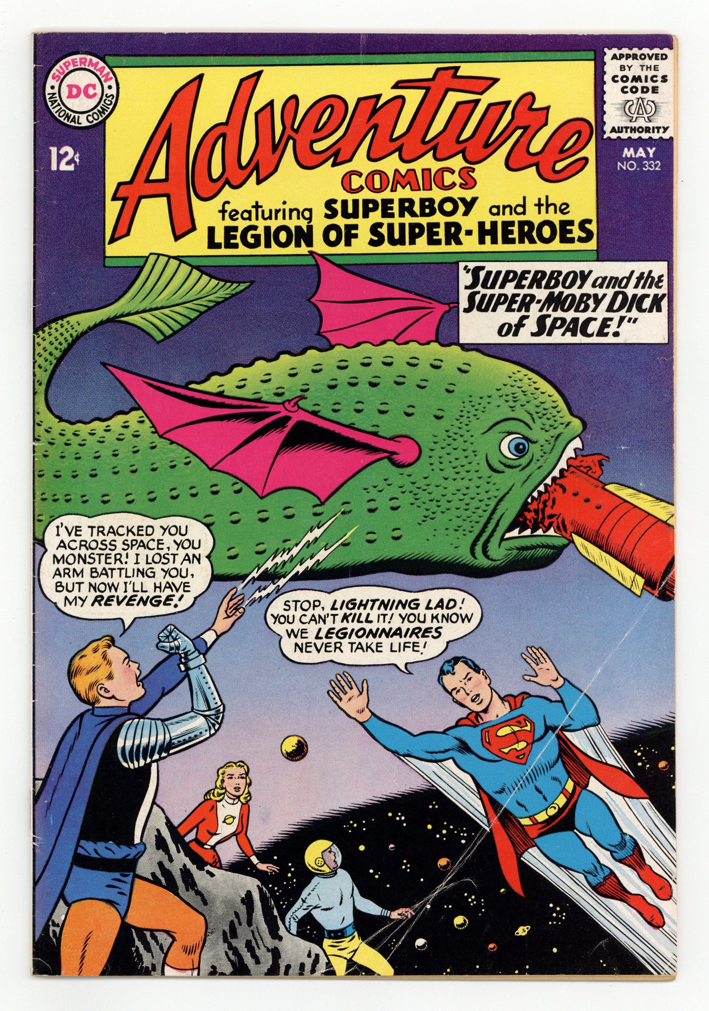 Cover pencils by Curt Swan, inks by George Klein. The Super-Moby Dick of Space!--Tales of the Legion of Super-Heroes, script by Edmond Hamilton, pencils by John Forte, inks by George Klein; Lightning Lad loses an arm to the Super-Moby Dick of Space; When Ultra Boy fails to subdue the space creature, Lightning Lad leads a team against it and shrinks the space creature to its original size with the help of the scientist who accidentally enlarged it. Letters from Bob Rozakis and Cary Bates. The Junior Super-Sleuths of Smallville!, art by John Sikela; Clark solves a mystery in which Lana appears to be a thief. Letter to the editor from comic writer Cary Bates. Rocky and Bullwinkle star in a one-page Cheerios ad. 36 Pages, Full Color. Cover price $0.12.