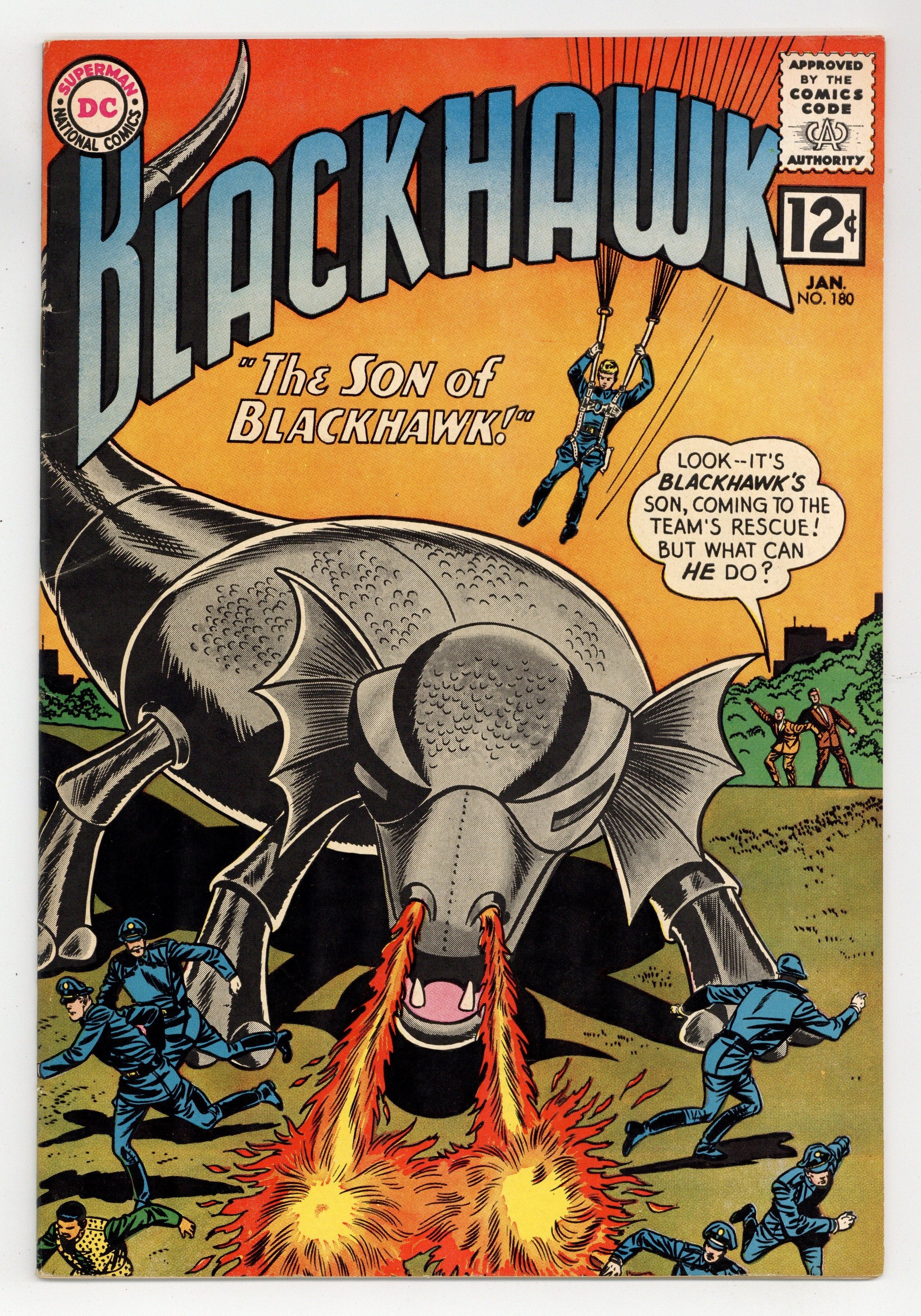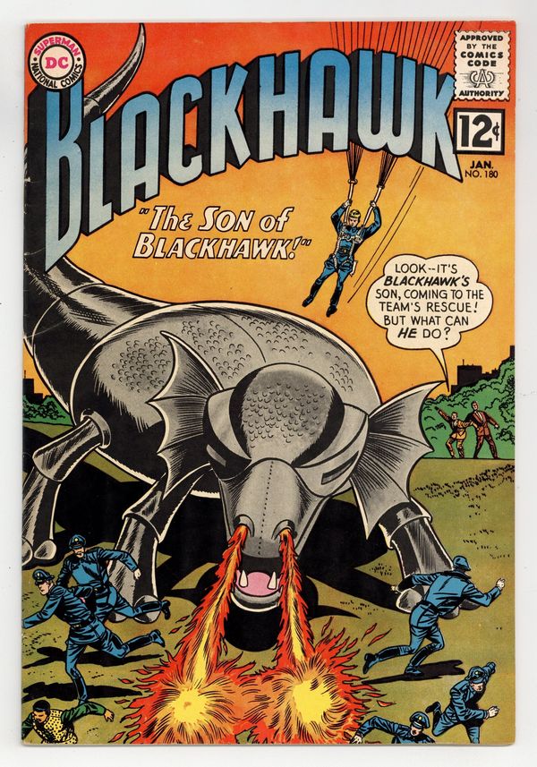 Will Blackhawk's son come to the team's rescue? Featuring: 8 page Blackhawk story "The Son of Blackhawk" drawn by Dick Dillin and Charles Cuidera; 7 page Blackhawk story "The Crazy Quilt Crimes" drawn by Dick Dillin and Charles Cuidera; 7 page Blackhawk story "The Mystery of the Lost Crusaders" drawn by Dick Dillin and Charles Cuidera. Cover by Dick Dillin and Sheldon Moldoff. Cover price $0.12.