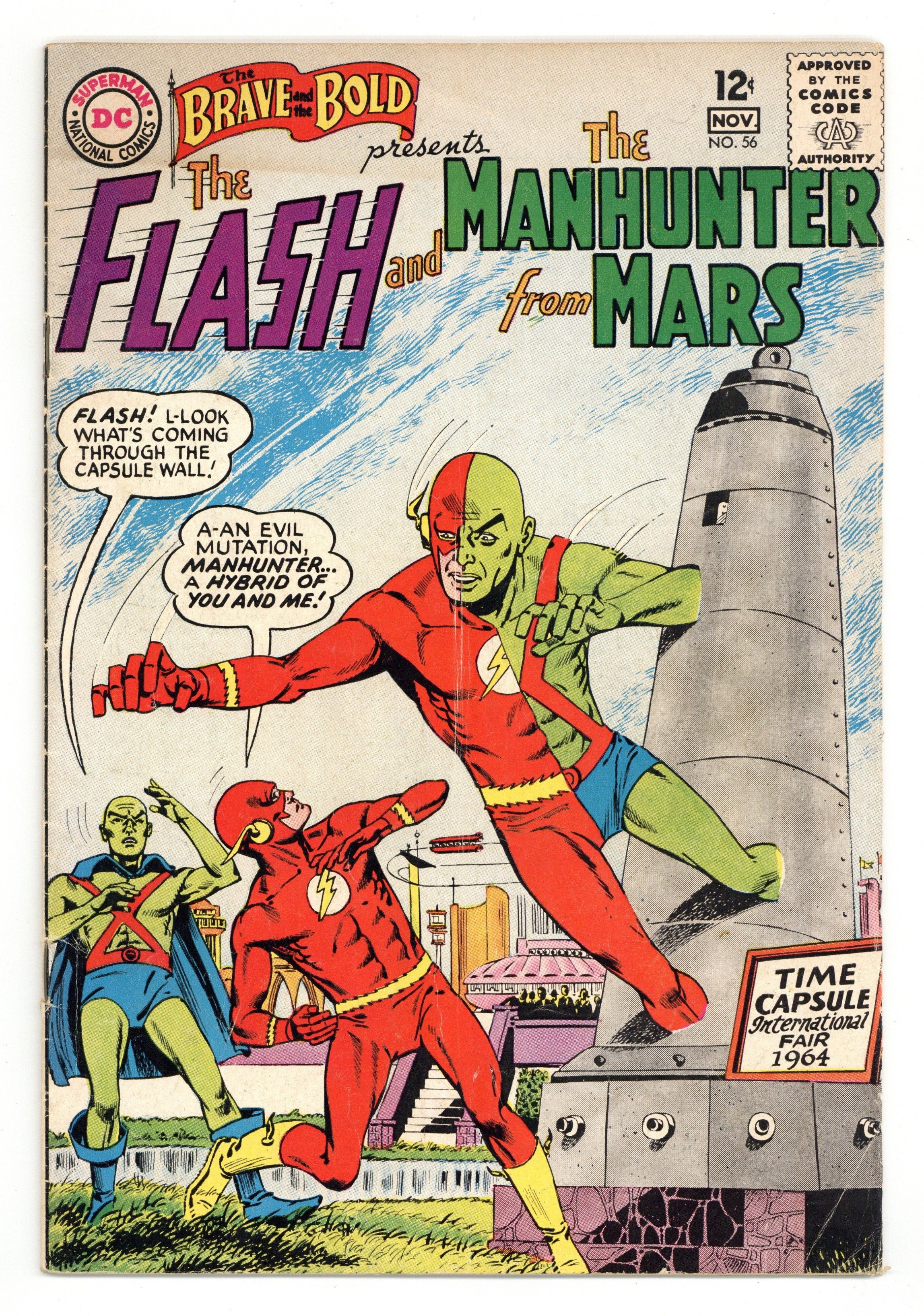 Cover by Bernard Baily. Smoking Is for Squares! public service announcement, script by Jack Schiff, art by Sheldon Moldoff. "Raid of the Mutant Marauders," script by Bob Haney, art by Bernard Baily; An android is created on the planet Argon with all the powers of the Justice League members, who is able to utilize the powers of two members at a time, and correspondingly takes a half-and-half appearance of those heroes (i.e., half-Flash / half-J'onn J'onzz); But when he falls in love with that planet's queen, is rejected, and is rocketed to Earth, the android goes on a rampage that even the Flash and the Martian Manhunter seem unable to halt. 36 Pages, Full Color. Cover price $0.12.