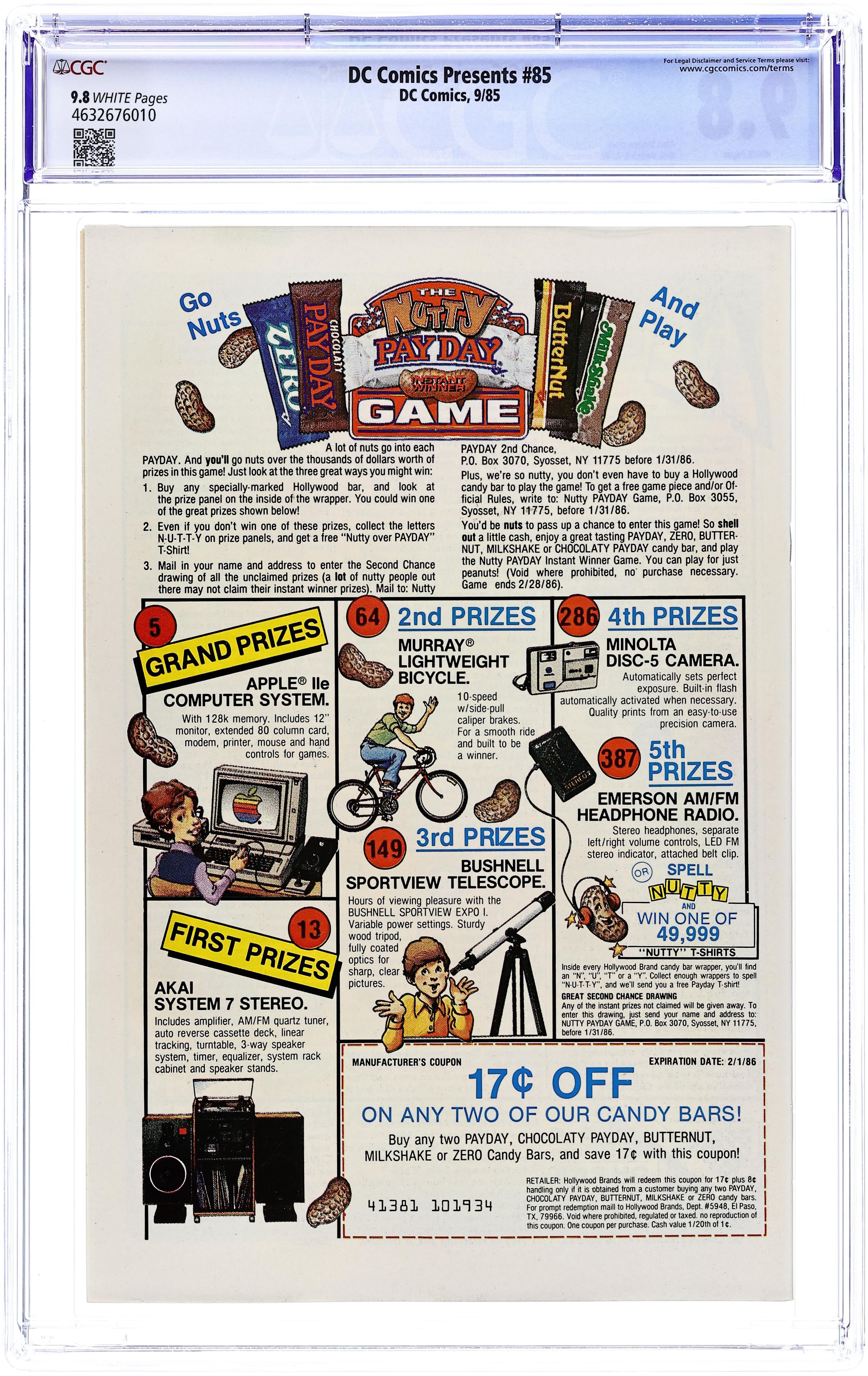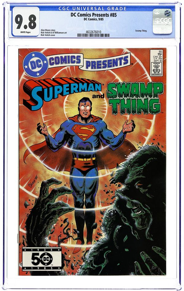 The Jungle Line! - Written by Alan Moore. Art by Rick Veitch and Al Williamson. Cover by Rick Veitch. Superman is dying and the only one that may be able to help him is the enigmatic creature of the Green known as Swamp Thing. Characters in this issue: Batman [Bruce Wayne] (cameo); The Flash [Barry Allen] (cameo); Lana Lang; Jimmy Olsen (cameo); Superman [Clark Kent]; Swamp Thing [Alec Holland]; Wonder Woman [Princess Diana] (cameo); Dr. Everett; Bloodmorel (a fungus). 32 pages, full color. Cover price $0.75.