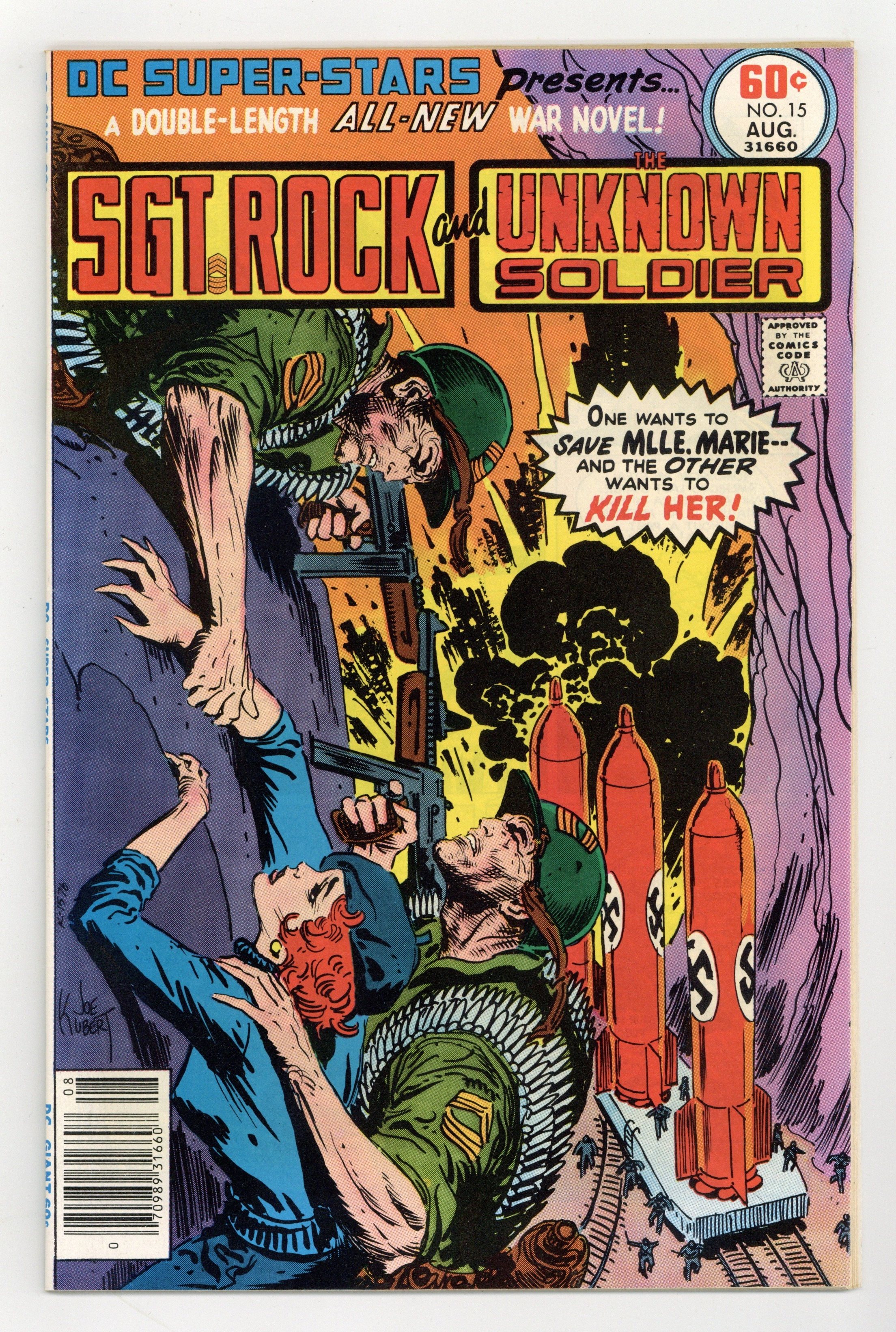 $16.25A double-length all-new war novel! Sgt. Rock and the Unknown Soldier -- one wants to save Mlle. Marie...and the other wants to kill her! Featuring: 30 page Sgt. Rock and the Unknown Soldier story "Heap the Corpses High!" written by Robert Kanigher and drawn by Lee Elias & Romeo Tanghal. Plus: 1 page Secret Army Files text article "Sgt. Rock of Easy Company"; 1 page Secret Army Files text article "The Unknown Soldier"; 1 page Secret Army Files text article "Mademoiselle Marie." Cover by Joe Kubert. Cover price $0.60.