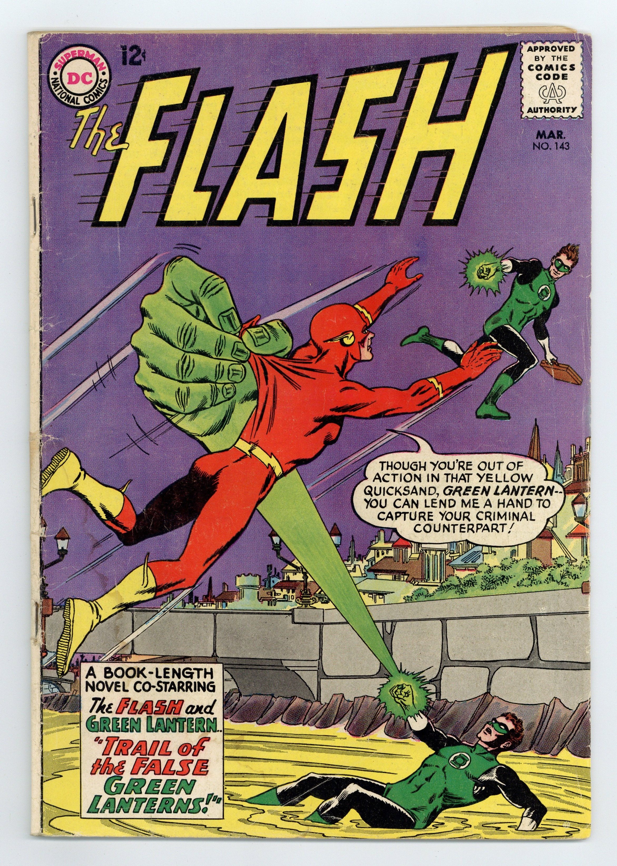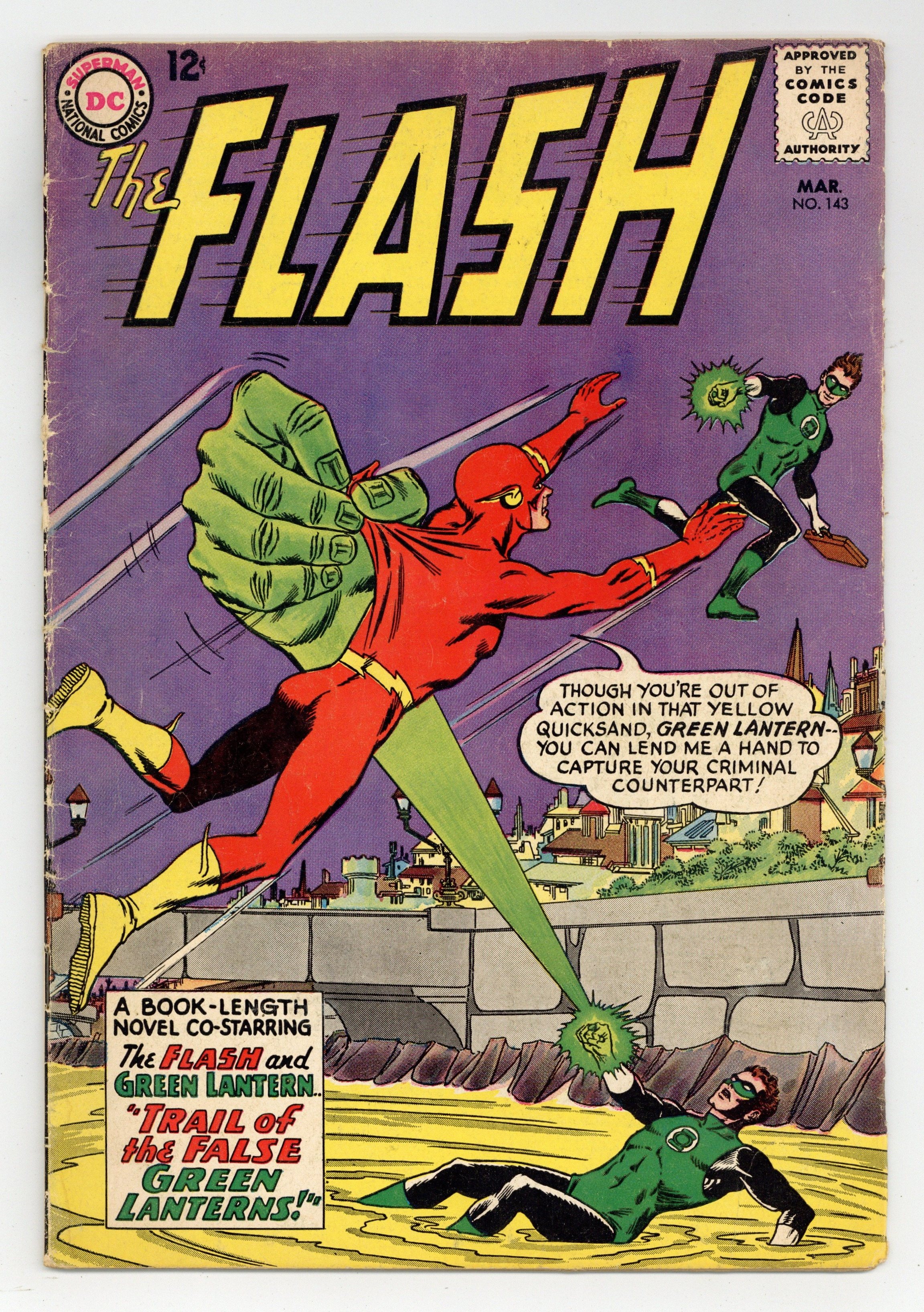Cover pencils by Carmine Infantino, inks by Murphy Anderson. Trail of the False Green Lanterns, script by Gardner Fox, pencils by Carmine Infantino, inks by Joe Giella; Barry "Flash" Allen and pal Hal "Green Lantern" Jordan take on three faux Green Lanterns. Sgt. Rocks Prize Battle Tales Giant Annual ad. Doom Patrol ad. Flash subscription ad. Flash Facts filler page. Back cover ad for Aurora Universal Monsters model kits. 36 Pages, Full Color. Cover price $0.12.