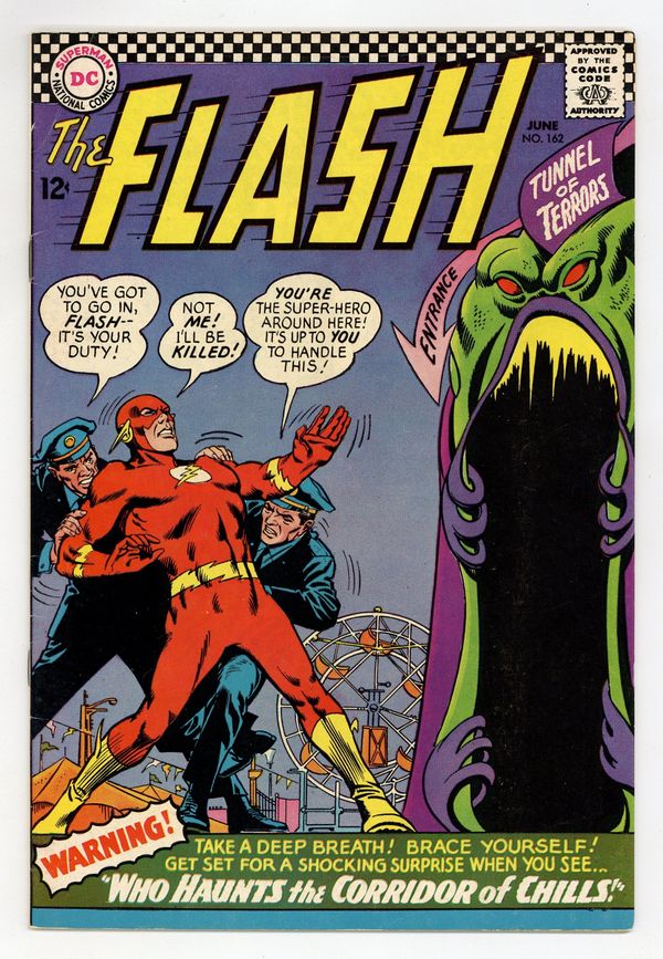 Tags: Flash$21.00Cover pencils by Carmine Infantino, inks by Joe Giella. Who Haunts the Corridor of Chills?, script by Gardner Fox, pencils by Carmine Infantino, inks by Joe Giella; A fearful Flash investigates strange goings on at a Disney Land-type amusement park. Ad for various DC TV shows. Caps Hobby Hints strip by Henry Boltinoff. 80 pg. Giant Superman ad. Full page Cheerios ad with Rocky and Bullwinkle. Letter from noted letter hack Guy H. Lillian III. Scooter ad. Palisades Amusement Park ad with Superman. Batman and Detective ad. G.I. Joe Club ad. 36 Pages, Full Color. Cover price $0.12.