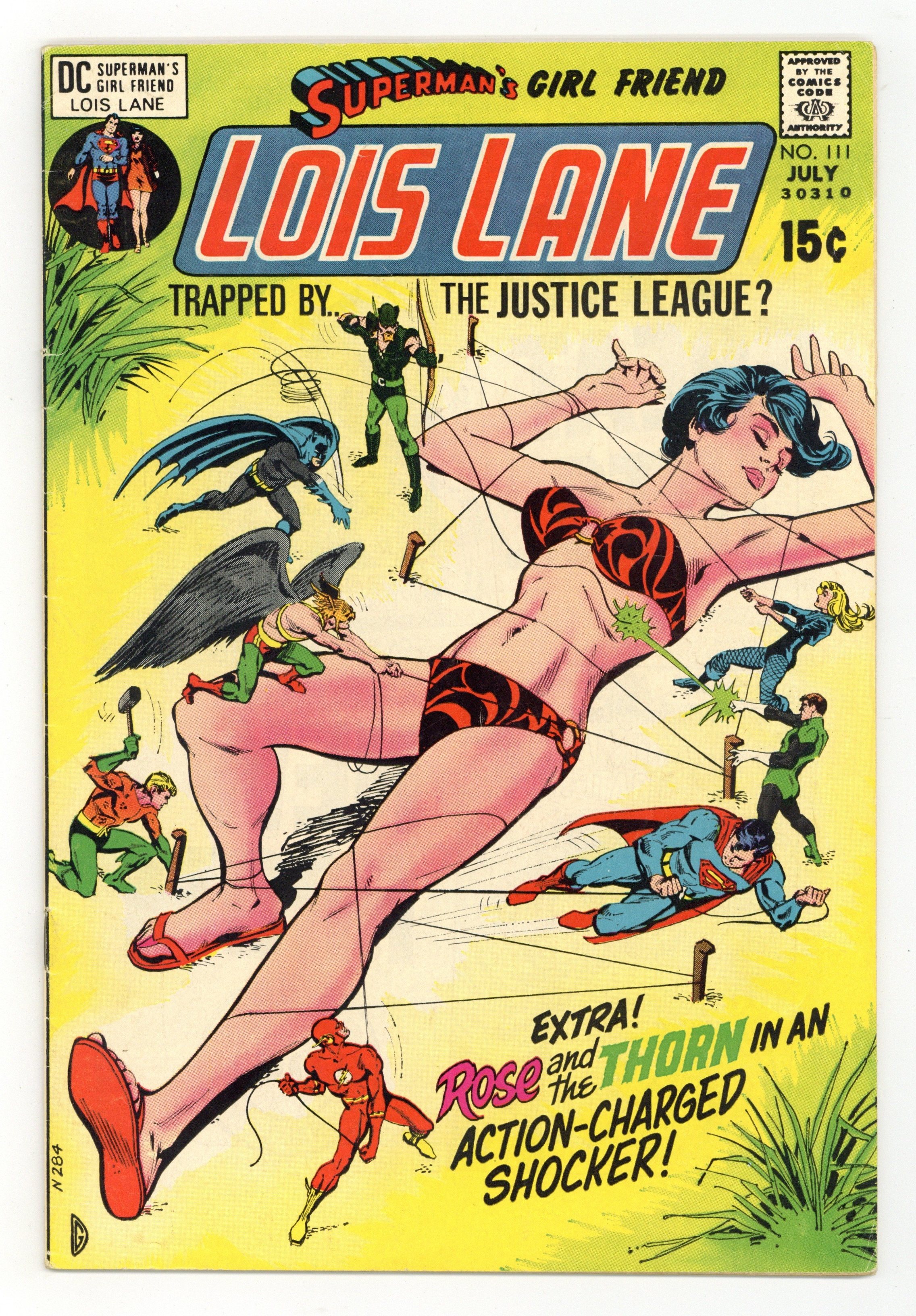 Cover art by Dick Giordano. The Dark Side of the Justice League!, script by Robert Kanigher, pencils by Werner Roth, inks by Vince Colletta and Murphy Anderson (Superman heads only); Evil scientists derive a potion to drive Superman mad; They have miniature clones of the Justice League apply it to Lois's lips while she's on vacation; When she kisses Superman, the potion takes effect and the mini JLA attacks her. Law of the 100!, script by Robert Kanigher, art by Gray Morrow; the 100 hires an amateur killer to eliminate the Thorn. House ad for In the Days of the Mob #1, pencils by Jack Kirby. 36 Pages, Full Color. Cover price $0.15.