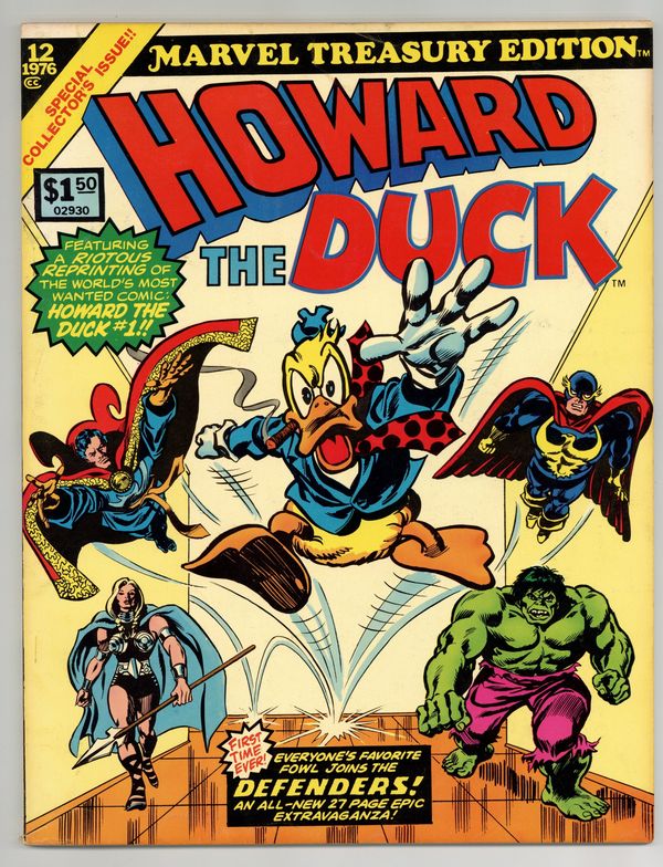 Tags: Treasury Sized Editions, Hulk$14.50Marvel Treasury Edition (1974) #12 features Howard the Duck. Includes the all-new adventure "The Duck and the Defenders" by Steve Gerber, Sal Buscema, and Klaus Janson. Also, reprints Fear #19 and Giant-Size Man-Thing #4-5 featuring "The Way it All Began" by Steve Gerber, Val Mayerik, and Sal Trapani, "Frog Death" by Steve Gerber and Frank Brunner, and "Hellcow" by Steve Gereber, Frank Brunner, and Tom Palmer. Guest-starring the Defenders (Valkyrie, Nighthawk, Dr. Strange, and the Hulk) and the Man-Thing. Plus, a special reprinting of Howard the Duck #1 by Steve Gerber, Frank Brunner, and Steve Leialoha. 82 pages. Cover price $1.50.