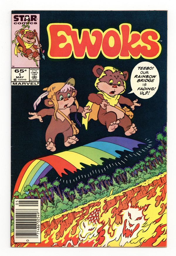 Tags: Star WarsPublished May 1985 by Marvel/Star Comics.$22.00Direct Edition. "The Rainbow Bridge!" Story by David Manak. Art by Warren Kremer and Marie Severin. The brave Ewoks from the Star Wars: Return of the Jedi get their very own comics series. Wicket and Teebo embark on an epic quest to save the village. FC, 32 pages Cover price $0.65.
