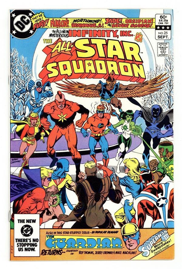 Direct Edition. Cover art by Jerry Ordway. The Infinity Syndrome!, script by Roy Thomas, pencils by Jerry Ordway, inks by Mike Machlan; the All-Star Squadron continue battling the Amazing Man; while at the War Department in Washington, the JSA learns of the Ultra-Humanite's plan to attack U.S. defense plants; the Amazing Man agrees to team with the All-Stars against the Ultra-Humanite. Letter from Sheldon Mayer. 36 pgs. $0.60. Cover price $0.60.