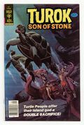 Published May 1979 by Dell/Gold Key.$18.00Cover price increases to 40 cents. Painted cover. Turok in "Island of the Doomed" Part 1 and 2 in which Turok and Andar help restore a banished leader back as the head of his tribe. Issue also has backup feature "Young Earth - Mystery of the Clay Statues," a one-page text feature "Prehistoric Americans: The Bighorn Hunters." No art/story credits given. All stories are reprints from issue number 74. 36 pages, full color. Cover price $0.40.