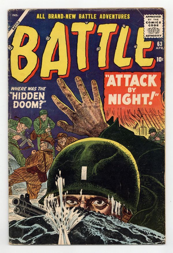 "The Iron Monster" (art by Joe Sinnott), "Attack By Night" (art by Dick Ayers), "The Hidden Doom" (art by Steve Ditko--yes, a Ditko war story!), "Bugle Call," "Kamikaze!" (art by Don Heck?), and a two-page text story, "The Duel." Cover price $0.10.