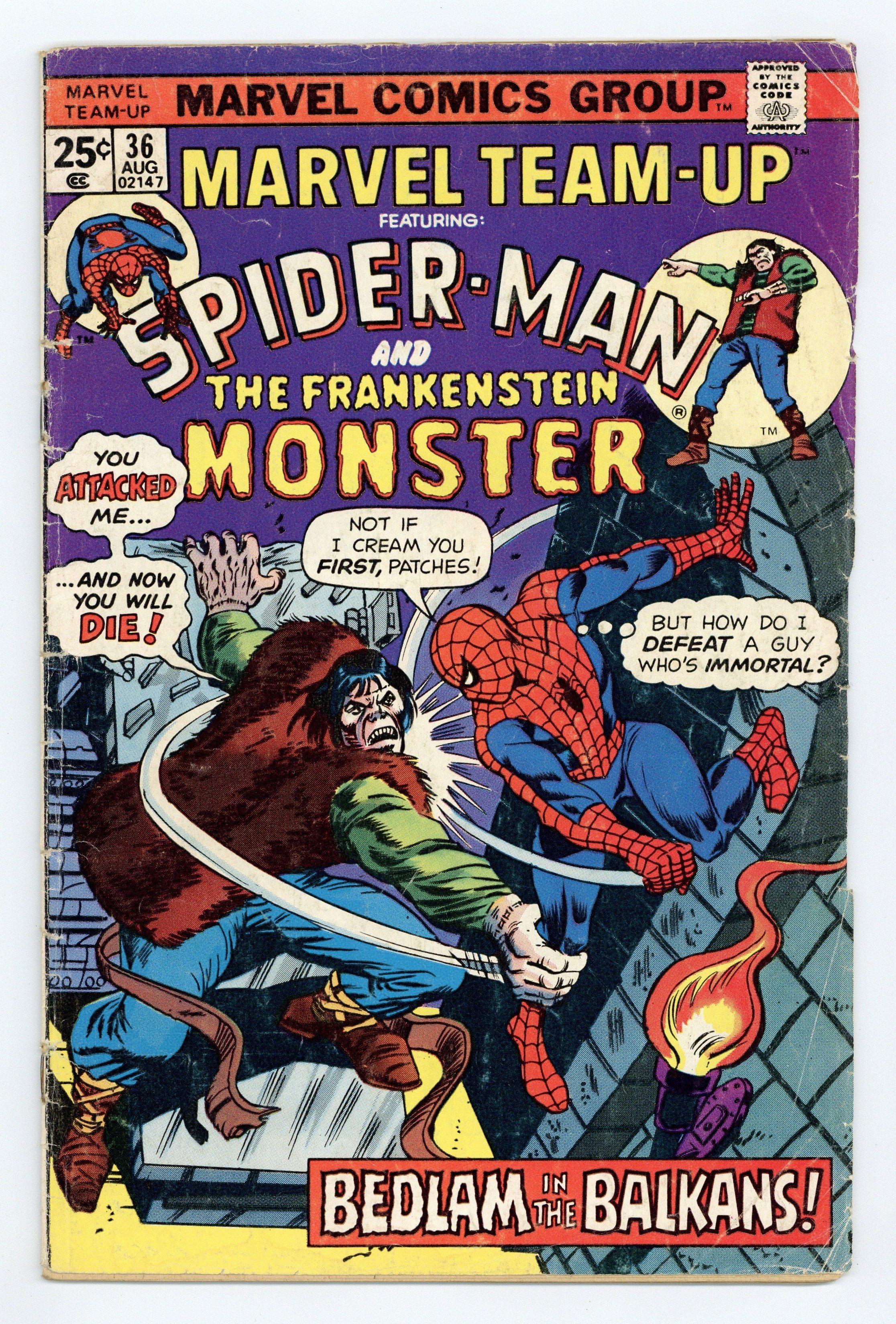 Tags: Spider-Man$13.00"Once Upon a Time, in a Castle" Part 1 of 2. Guest-starring Spider-Man and the Frankenstein Monster. Script by Gerry Conway. Art by Sal Buscema (layouts) and Vince Colletta (finishes). Cover by Ed Hannigan and Mike Esposito. At some point in high school, Peter Parker probably read Mary Shelley's classic novel "Frankenstein." At no point though did Peter think he might someday team up with Victor Frankenstein's creation! But due to a strange series of events, the Amazing Spider-Man finds himself across the Atlantic Ocean, in the Balkans, and inside the castle of the evil Baron von Shtupf...with only one friend by his side: the Frankenstein monster! It's a literary team up for the ages as the wondrous wall-crawler and the man-monster from the pages of a 19th century novel join forces...to save the world! Cameo appearance by the Man-Wolf. (Notes: Frankenstein previously appeared in Frankenstein Monster 18. This issue includes a 2-page retelling of the origin of Frankenstein's monster.) 36 pages. Cover price $0.25.