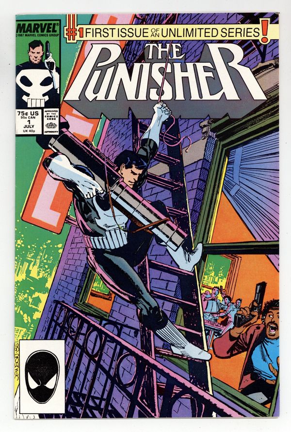 Tags: Marvel Legacy Numbering: Punisher (part 6), Punisher$19.50Direct Edition. Story by Mike Baron. Art by Klaus Janson. Vietnam vet Frank Castle's wife and children were caught in the crossfire of warring crime families. Now, he's back and they're all going to pay. All of them. Those that visit harm on others will come to know him as the Punisher. Frank starts up his first ongoing series with guns blazing. His first target, a drug dealer who thinks he's above the law. Well, he's not above Punishment. Cover price $0.75.