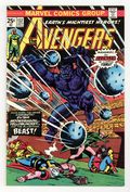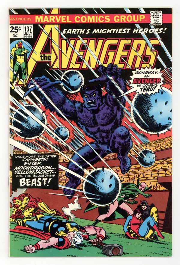 "We Do Seek Out New Avengers!" Part 1 of 2. Script by Steve Englehart. Pencils by George Tuska. Inks by Vince Colletta. Cover by John Romita. The epic celestial madonna saga has concluded in Giant-Size Avengers 4. And now Earth's Mightiest Heroes need to replenish their ranks! Moondragon, the Wasp, and Yellowjacket quickly sign up, but the Avengers still need one more member, so Iron Man and Thor hold tryouts at Shea Stadium. Who will answer the call to join? The bombastic Beast! However, someone else shows up at Shea Stadium too...the powerful Stranger! Will Hank McCoy survive his tryout? Meanwhile, the Vision and the Scarlet Witch enjoy their honeymoon in French Polynesia; and Hawkeye leaves the Avengers to go back in time to find the Black Knight. Cameo appearances by Agatha Harkness, the Black Panther, Black Widow, Captain America, Hercules, and Quicksilver. 36 pgs. Cover price $0.25.
