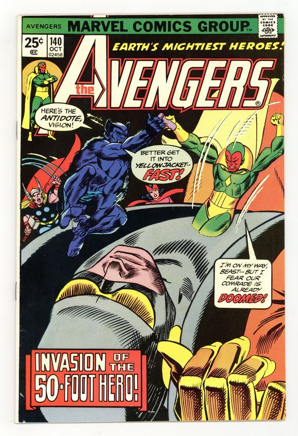 Tags: Marvel Legacy Numbering: Avengers (part 140), Avengers$16.50"A Journey to the Center of the Ant" Part 2 of 2. Script by Steve Englehart. Pencils by George Tuska. Inks by Vince Colletta. Cover by Gil Kane and Mike Esposito. Yellowjacket has collapsed on the street outside the hospital following last issue's battle! And now his body is growing with every passing second! Fortunately though, the Beast has a plan to save Hank Pym! First, get a special serum from Hank McCoy's old laboratory at the Brand Corporation; and second, get the serum inside Yellowjacket as soon as possible! The Beast can handle step one, but who will take care of step two? The incomparable Vision! And in an awesome reversal of events from the classic Avengers 93, the synthezoid avenger enters the body of Hank Pym! Avengers Lineup: Beast, Iron Man, Moondragon, Scarlet Witch, Thor, Vision, Wasp, and Yellowjacket. Cameo appearance by Patsy Walker. 36 pages Cover price $0.25.