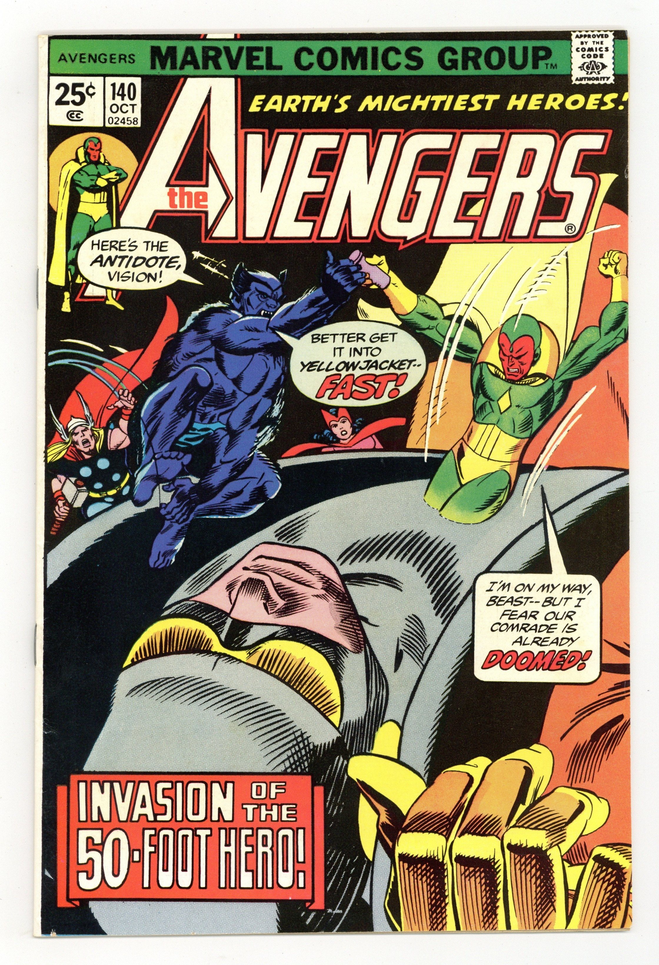 "A Journey to the Center of the Ant" Part 2 of 2. Script by Steve Englehart. Pencils by George Tuska. Inks by Vince Colletta. Cover by Gil Kane and Mike Esposito. Yellowjacket has collapsed on the street outside the hospital following last issue's battle! And now his body is growing with every passing second! Fortunately though, the Beast has a plan to save Hank Pym! First, get a special serum from Hank McCoy's old laboratory at the Brand Corporation; and second, get the serum inside Yellowjacket as soon as possible! The Beast can handle step one, but who will take care of step two? The incomparable Vision! And in an awesome reversal of events from the classic Avengers 93, the synthezoid avenger enters the body of Hank Pym! Avengers Lineup: Beast, Iron Man, Moondragon, Scarlet Witch, Thor, Vision, Wasp, and Yellowjacket. Cameo appearance by Patsy Walker. 36 pages Cover price $0.25.