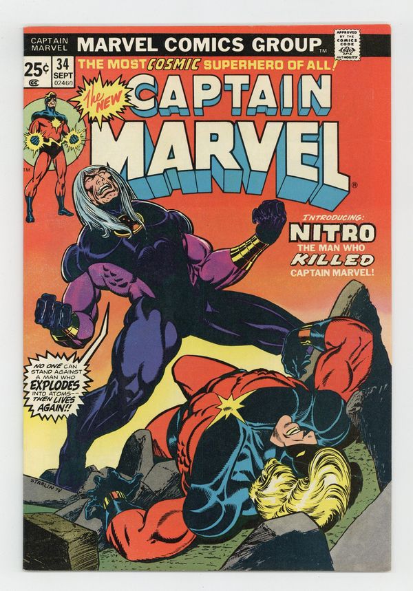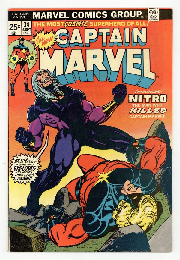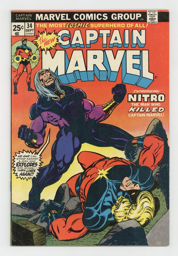 First appearance of Nitro in "Blown Away!" Script by Steve Englehart, plot and pencils by Jim Starlin (final full issue), inks by Jack Abel. Appearances by Carl Danvers and Rick Jones. Cameos by Moon Dragon, Drax the Destroyer, and Iron Man. PLUS, the events of this issue directly lead to the cancer that eventually takes Marvel's life in the classic "Death of Captain Marvel" Graphic Novel. The letters page contains Marvel Value Stamp series A # 25 (the [Human] Torch). Starlin cover. Cover price $0.25.