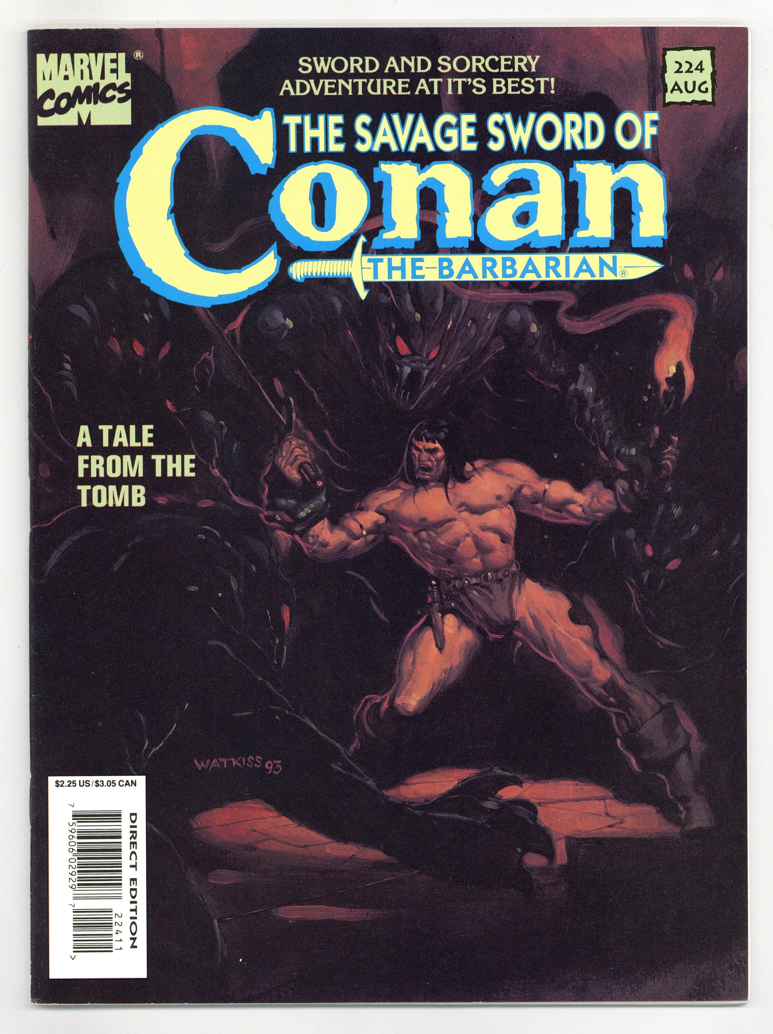 $13.50Conan stars in "The Dwellers Under the Tombs." Script by Roy Thomas, art by John Watkiss. Conan and Red Sonja star in "Dragons of the World's Dawn." Script by Thomas, pencils by Mike Docherty, inks by E.R. Cruz. Fred Harper pin-up. Watkiss cover. Cover price $2.25.