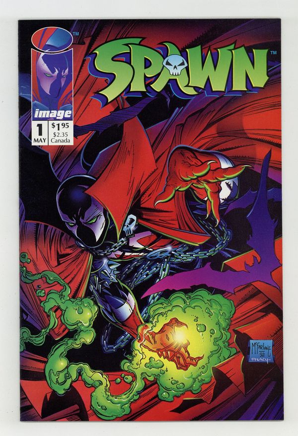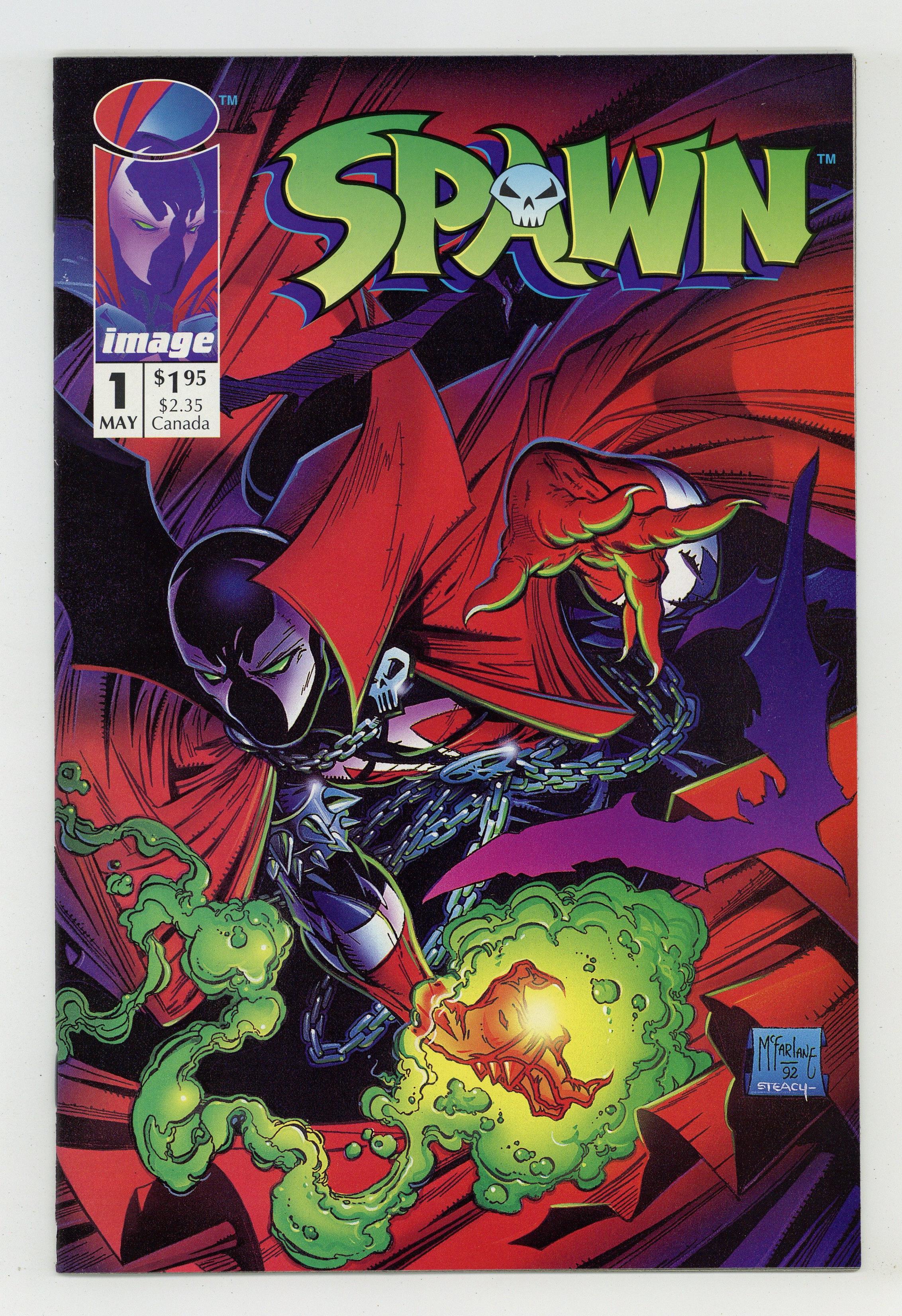 Direct edition. "Questions!" Part 1 of 4. Created, story, and art by Todd McFarlane. When government assassin Al Simmons is murdered, a deal with the devil brings him back to the realm of the living. But now he walks the shadows as the disfigured soldier of hell known as Spawn. Armed with unimaginable, but finite, magical abilities, Spawn is destined to play an important role in the upcoming Armageddon. But, what happens when this rebellious anti-hero decides he won't fight for either side? Superstar artist and Image co-founder, Todd McFarlane, creates a character who has gone on to inspire a major motion picture, an HBO animated series, numerous spin-off comic series, and one of the most successful toylines of all time. Spawn centerfold by Todd McFarlane & Ken Steacy. Pin-up of Spawn by George Perez. Pin-up of PITT by Dale Keown. Cover by McFarlane & Steacy. 1st app of Sam and Twitch Cover price $1.95.