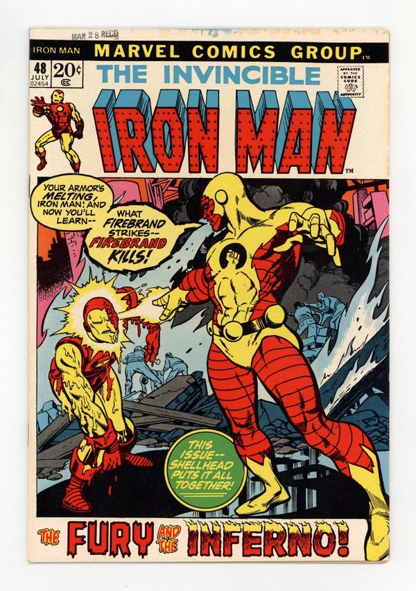 Tags: Marvel Legacy Numbering: Iron Man (part 48), Iron Man$42.00"The Fury and the Inferno!" Story by Mike Friedrich. Art by George Tuska and Vince Colletta. Cover by Gil Kane. The battle is still raging between Tony Stark and Simon Gilbert for control of Stark Industries! Tony fires the entire board of directors, but the chairman of the board, Simon Gilbert, is not going quietly. He arranges for an old enemy of Iron Man to attack the munitions plant. It's another great showdown: Iron Man vs. Firebrand! 32 pages, full color. Cover price $0.20.