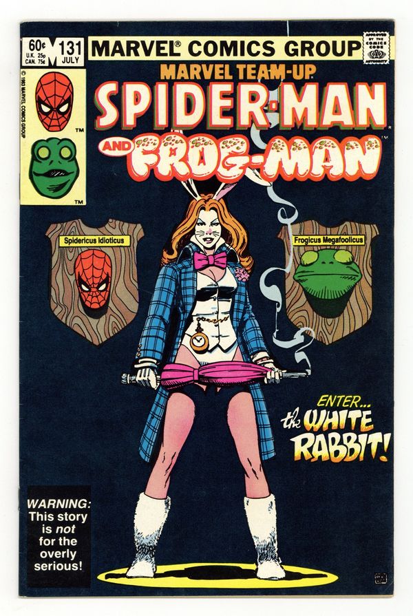 Direct Edition. "The Best Things In Life Are Free...But Everything Else Costs Money!". Guest-starring Spider-Man and Frog-Man. Script by J.M. DeMatteis. Pencils by Kerry Gammill. Inks by Mike Esposito. Cover by Paul Smith. Eugene Palilio had such a great time playing Frog-Man (in Marvel Team-Up 121) he decides that it's time for another adventure! When an opportunity presents itself during a restaurant robbery, Frog-Man springs into action! Predictably, Eugene gets in over his head against the White Rabbit, so the web-slinger swoops in to rescue his besieged friend! After another close life-and-death call, Eugene will probably wise up and retire...or will he? Not as long as the White Rabbit is on the loose! First appearance of the White Rabbit. Flashback cameo by Daredevil. 36 pages. Cover price $0.60.