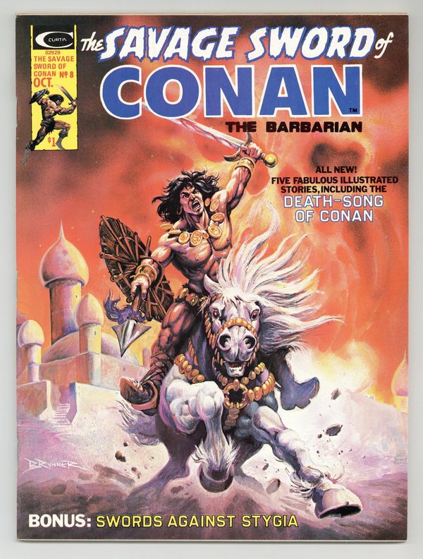 Starts Apr 20 Conan stars in "The Forever Phial." Script by Roy Thomas, art by Tim Conrad. "Death-Song of Conan the Cimmerian." Poem by Lin Carter (adapted by Thomas), art by Jess Jodloman. Conan stars in "Corsairs Against Stygia." Script by Thomas, pencils by Gil Kane, inks by Yong Montano. Adapted from the Robert E. Howard novel "The Hour of the Dragon." Continued from Giant-Size Conan the Barbarian 4. The story concludes in SSOC 10. Also in this issue: "Sorcerer's Summit." Script and art by Bruce Jones. The Hyborian Age (part 2): "The Rise of the Hyborians." Script by Thomas, art by Walt Simonson. Adapted from the essay by Robert E. Howard. "The Elder Gods." Article by Robert Yaple with a full-page illustration by Tim Conrad (?). Tony DeZuniga frontispiece. Frank Brunner cover.