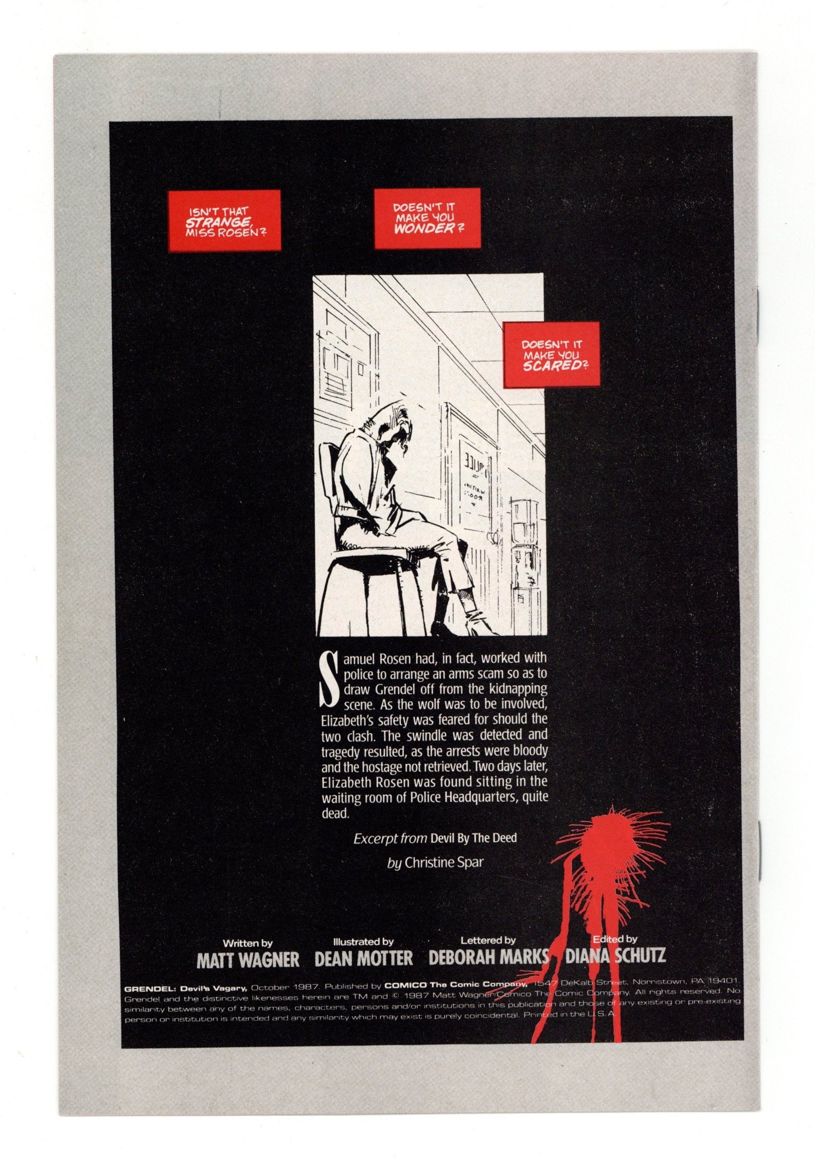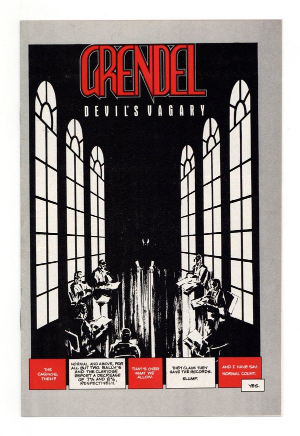 $30.00This rare 16-page premium comic has never been reprinted anywhere (see GRADING NOTE THAT FOLLOWS). Published in October 1987, Grendel: Devil's Vagary is a 16-page comic, printed in black, white and red. It was originally part of the Grendel Comico Collection which included a deluxe, silver embossed slipcase, ten Comico back issues (including a random copy of Grendel), a Comico wall poster, and a copy of the Comico Comming Attractions newsletter. GRADING NOTE: Due to the way this items was packaged with other items when originally released, NM-Mint copies are very rare. Most copies, even when well-cared for, are typically FN to VF at best.