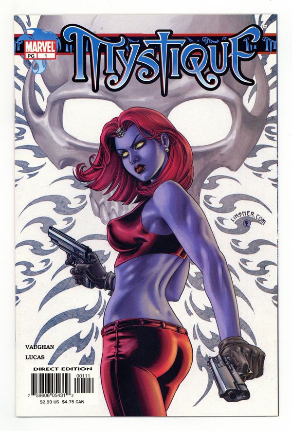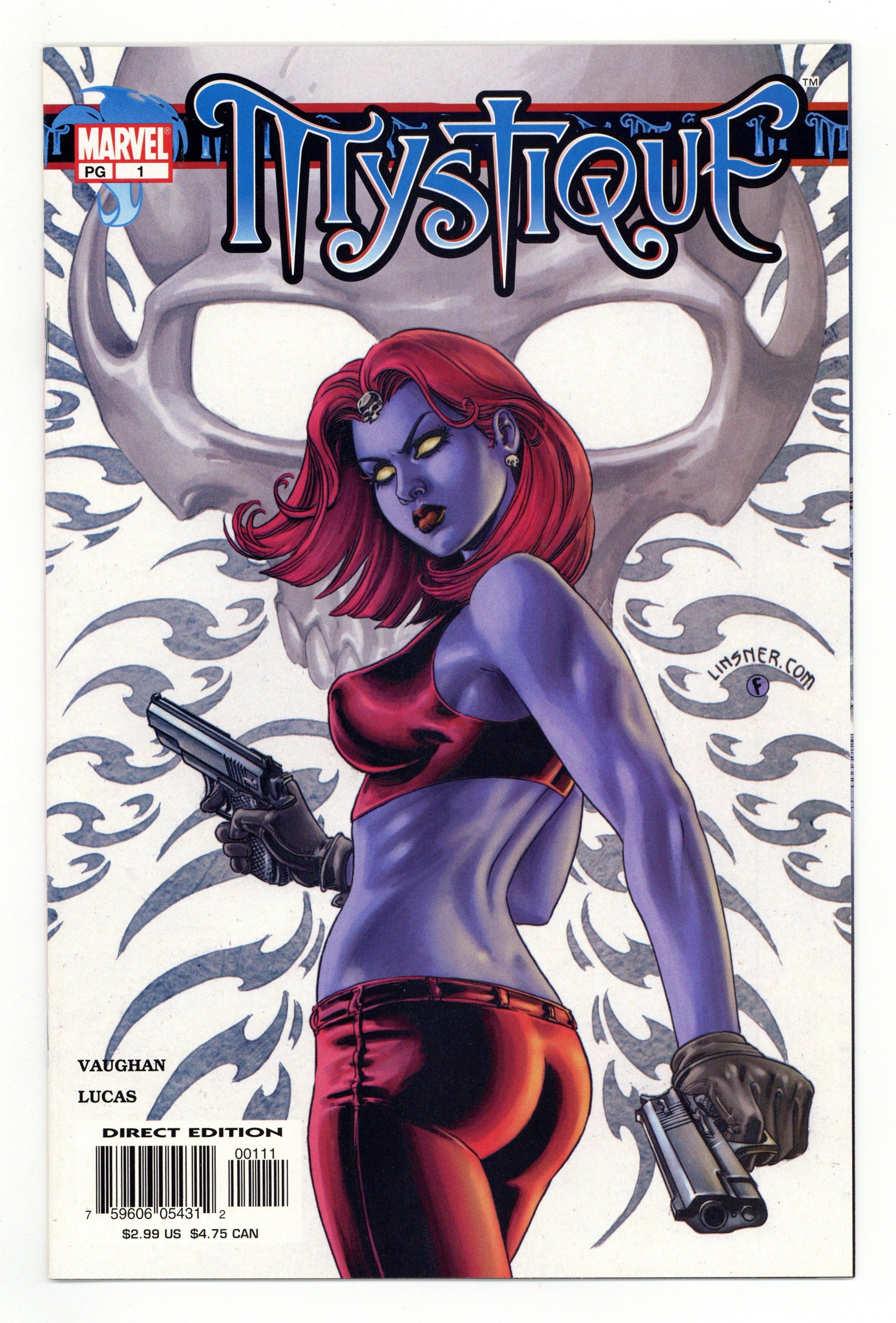 DEAD DROP GORGEOUS: Part 1 of 6 - Cover by Joseph Michael Linsner Brian K. Vaughan (w)/Jorge Lucas (p) Mystique can be anything you want her to be... In a world of intrigue and seduction, where mutants are feared and hated and the X-MEN are not enough to protect them, Mystique uses her shape-shifting abilities to further her own mutant rights agenda. And to get want she wants, she's not afraid to do WHATEVER's necessary. Mystique's true motives are put to the test in this brand new beginning for the mutant chameleon. 32 PGS. WITH ADS/FC/MARVEL PG...$2.99 Cover price $2.99.