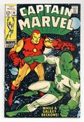 Last 12-cent cover price. Cover pencils by Frank Springer and John Romita (alterations), inks by Vince Colletta and John Romita (alterations). "When a Galaxy Beckons," script by Gary Friedrich, pencils by Frank Springer, inks by Vince Colletta; Held at gun point at the Cape for treason charges, Mar-Vel trys to figure out what to do while Carol tries to appear for Mar-Vell's release; While at the same time the Puppet Master--from his island hideout--uses one of his special puppets to take control of Iron Man, part of a plan to aid Egghead against the Avengers (See Avengers #64); Iron Man, in his civilian guise as Tony Stark is on his way to business in Miami, is controlled by the Puppet Master to change into Iron Man and leaves the plane to attack Mar-Vell; The Puppet Master manages to have Iron Man attack Mar-Vell, however the battle ends when unexpectedly when Stark's heart condition causes Stark to have a heart attack; A furious Puppet Master, not knowing why Iron Man no longer response to his command, throws his puppet at the controls causing an explosion that buries the Puppet Master under his machinery. 36 pgs., full color. Cover price $0.12.