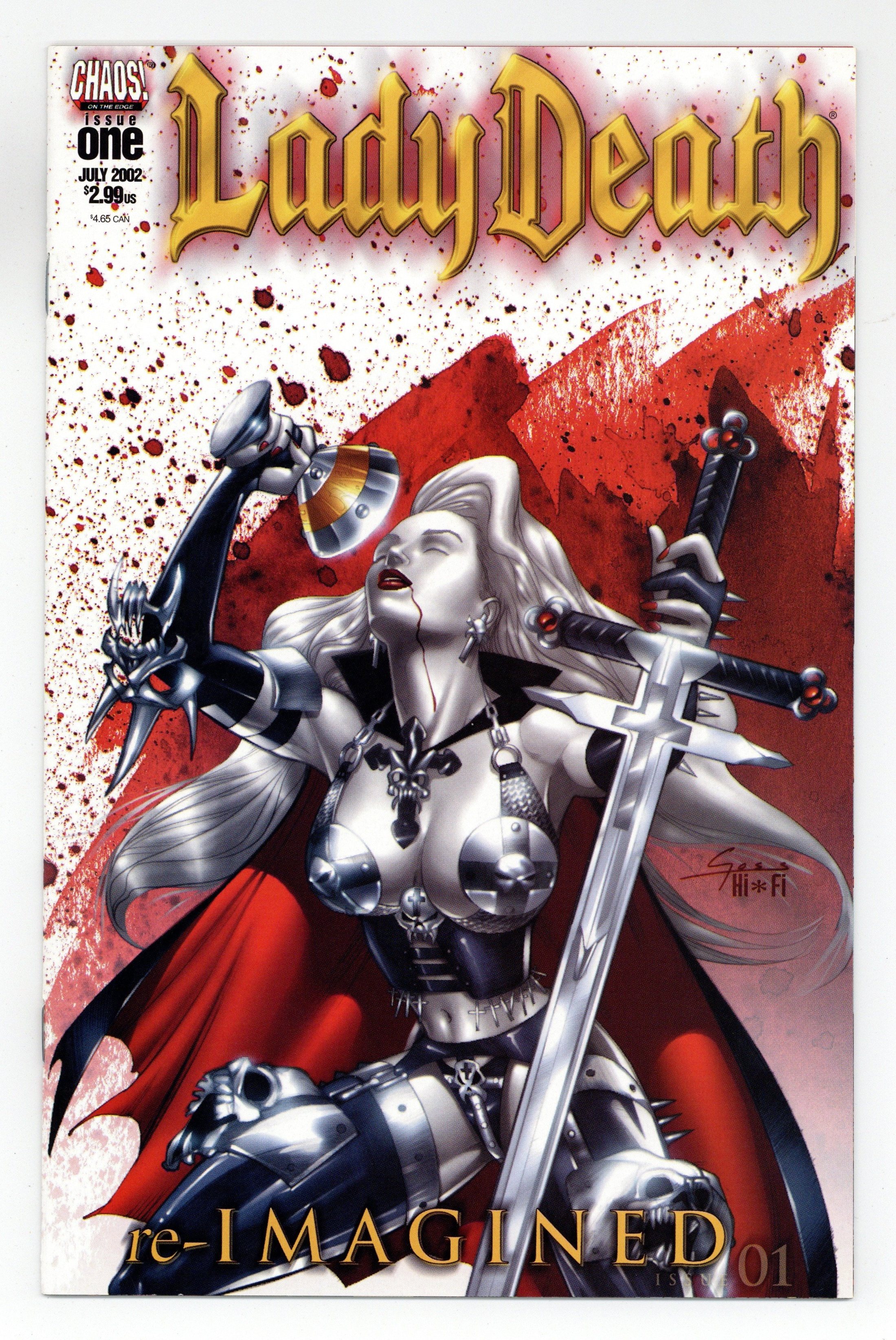 by Bradley J. Kayl & Eddy Burrows "Re-Imagined" means a tale set in a different time, a different place. Re-discover Lady Death all over again as Chaos! proudly "Re-Imagines" her crucial origin! Embark on a sensational adventure as the exciting talent of Team Red Star brings Lady Death: Re-Imagined to life! This tale of the Templar Knights and the Spanish Inquisition is set in medieval Europe, in the year 1300. Faith, the daughter of the Grand Inquisitor, must overcome her father's treachery as he seeks the Holy Grail. What perils await her? And how does she become Lady Death? Get to know her again... like you've never seen her! Cover by Christian Gossett. FC, 32pg $2.99 Cover price $2.99.