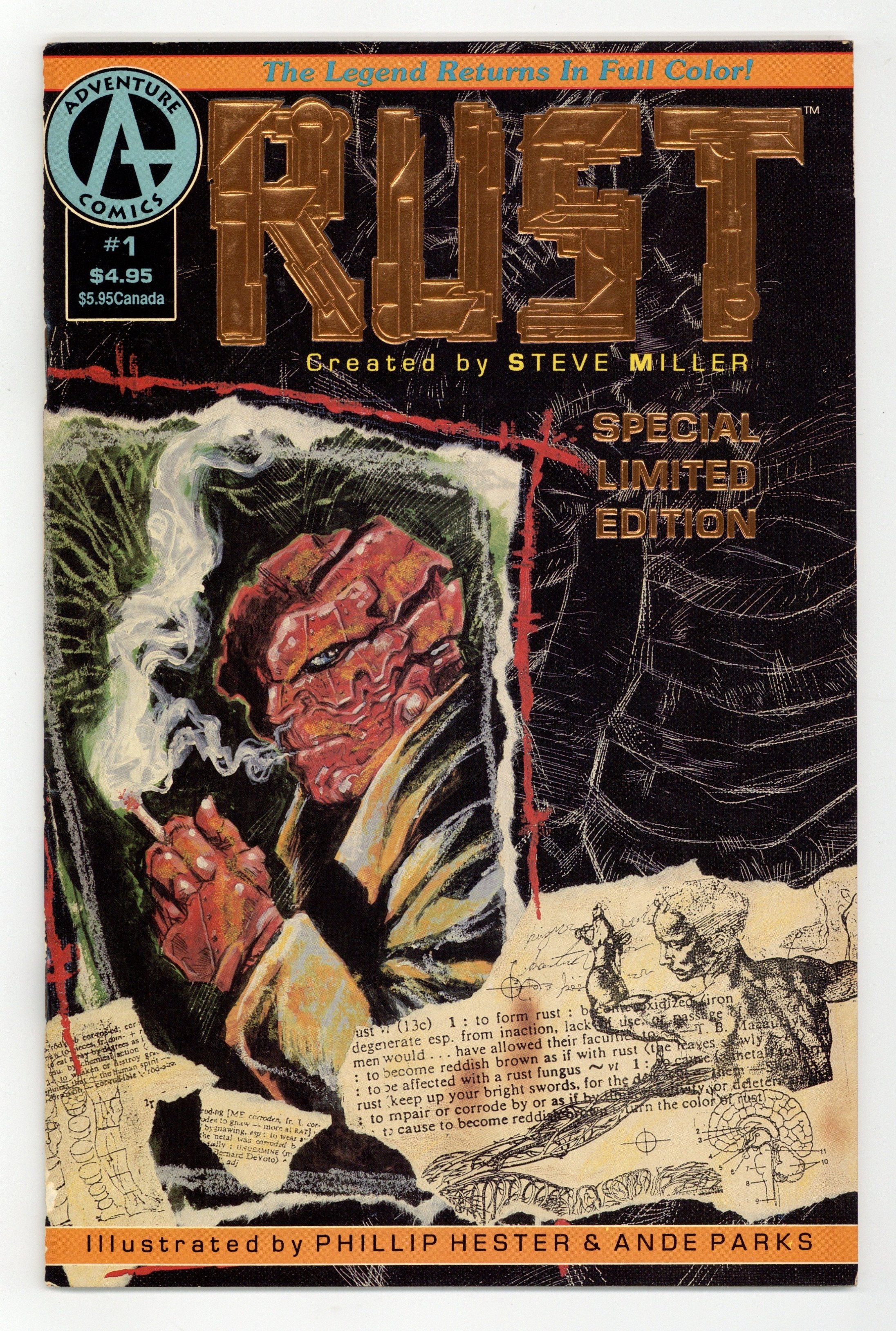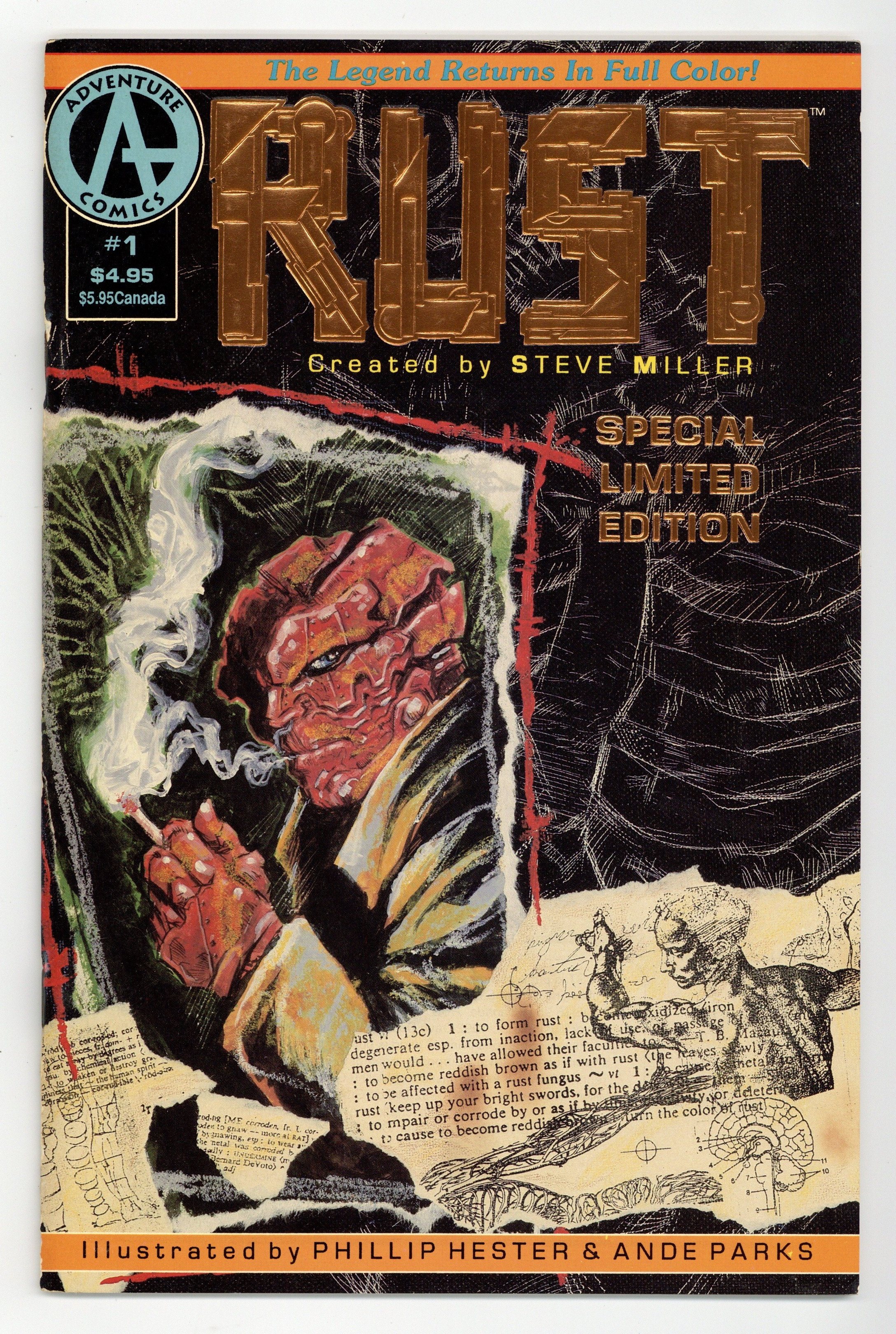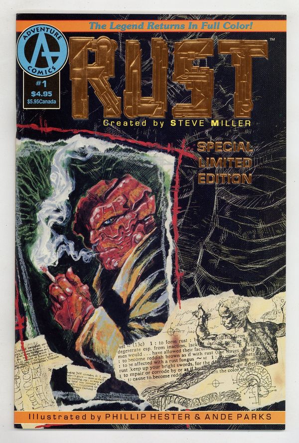 Limited Edition foil cover by Phil Hester and Ande Parks. Story by Steve Miller. Art by Phil Hester and Ande Parks. Creator Steve Miller reboots the cult series about a reluctant superhero, with art by future Green Arrow sensations Hester and Parks. After a freak accident, police officer Scott Baker police officer Scott Baker gains mastery over metal, as well as a metallic shell he cannot take off. Also features an issue guide to the previous Rust series and a Phil Hester Rust sketchbook. 44 pages, Full Color. Cover price $4.95.