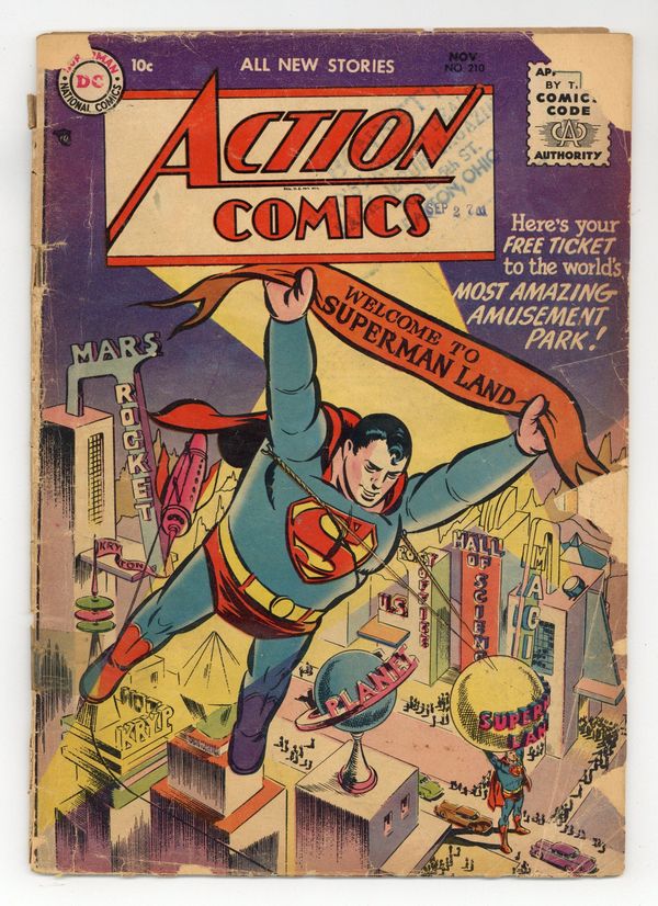 Cover pencils by Wayne Boring, inks by Stan Kaye. "Superman in Superman Land," script by Bill Finger, pencils by Wayne Boring, inks by Stan Kaye; As thousands of people flock to the opening of Superman Land, a brand-new amusement park, Lex Luthor sets up a Kryptonite trap for Superman. Supermen of America ad. "The Master of the Beasts," art by Ed Smalle; Congo Bill and Janu encounter a man who can seemingly control the wild animals of the jungle. -page Chief Hot Foot story by Henry Boltinoff. Caves of Adventure article by Jack Miller (as John Mallon). "Movie Makers from Outer Space" starring Tommy Tomorrow, script by Otto Binder, art by Jim Mooney. 3/4-page Little Pete story by Henry Boltinoff. 36 Pages, Full Color. $.10 Cover price $0.10.