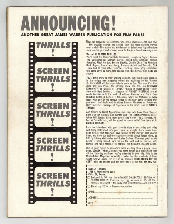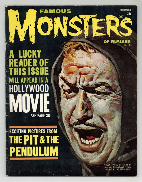 Features in this issue include: an article on the films of Bert I. Gordon; a spotlight on makeup artist Dick Smith; a preview and synopsis of Roger Corman's The Pit and the Pendulum; and more. Painted cover by Basil Gogos is of Vincent Price from The Pit and the Pendulum. Cover price $0.35.