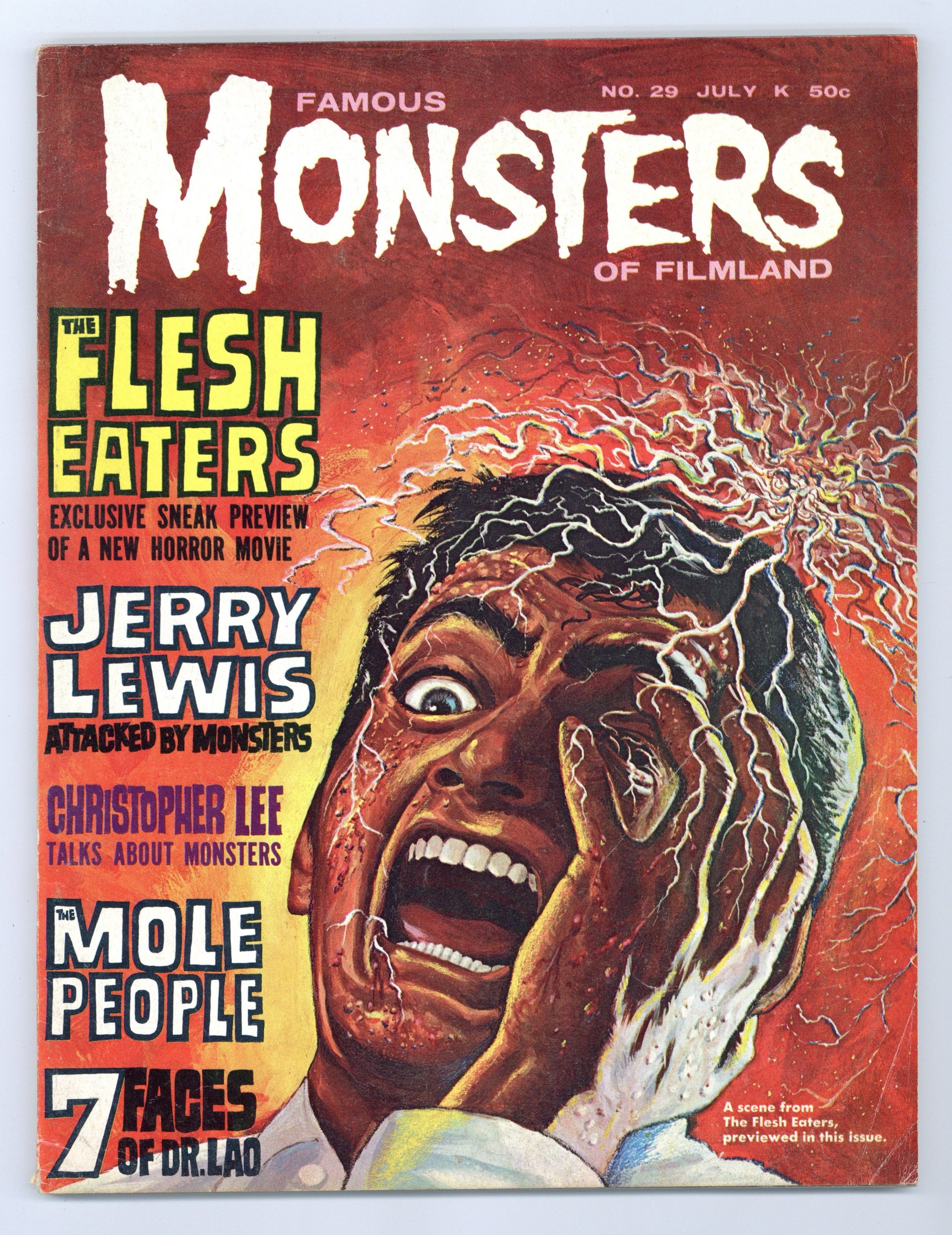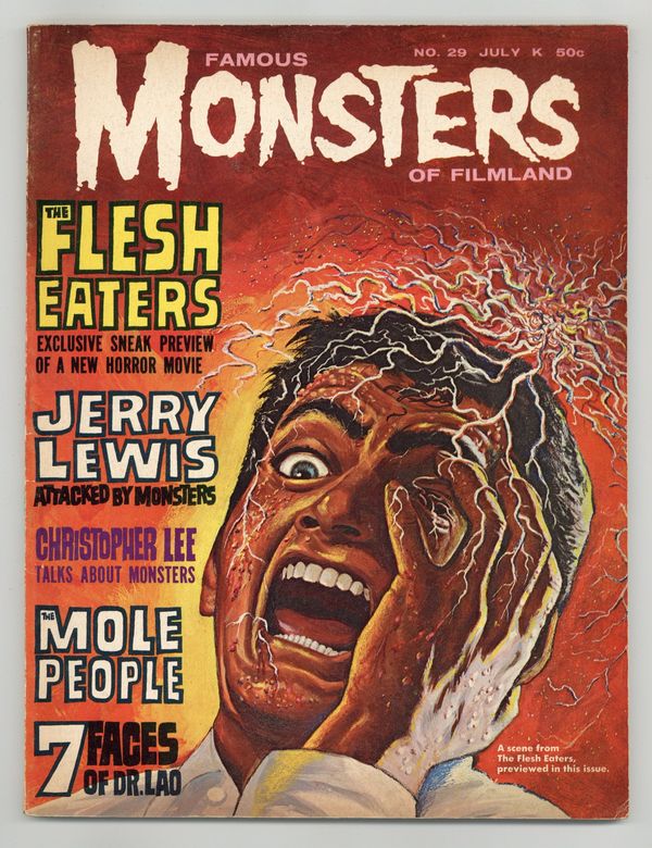 Features in this issue include: a reprint of DC Comics' "Jerry Lewis Meets the Monsters"; a preview of The Seven Faces of Dr. Lao; a werewolf story by 14 year old Alan B. Green; part two of the Island of Lost Souls filmbook; a Peter Lorre obituary; and more. The cover is a painting (artist unknown) of a character from The Flesh Eaters. Cover price $0.50.