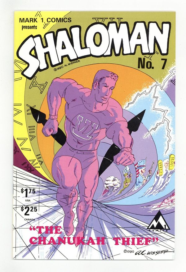 Mark 1 Comics Presents: Shaloman. "The Chanukah Thief." Story and art by Al Wiesner. Dr. Traif goes back in time with a time machine to spill out the sacred oil before the Maccabees can find it. Cover price $1.75.
