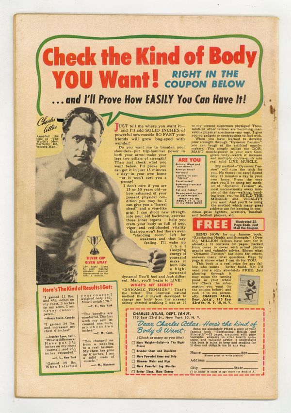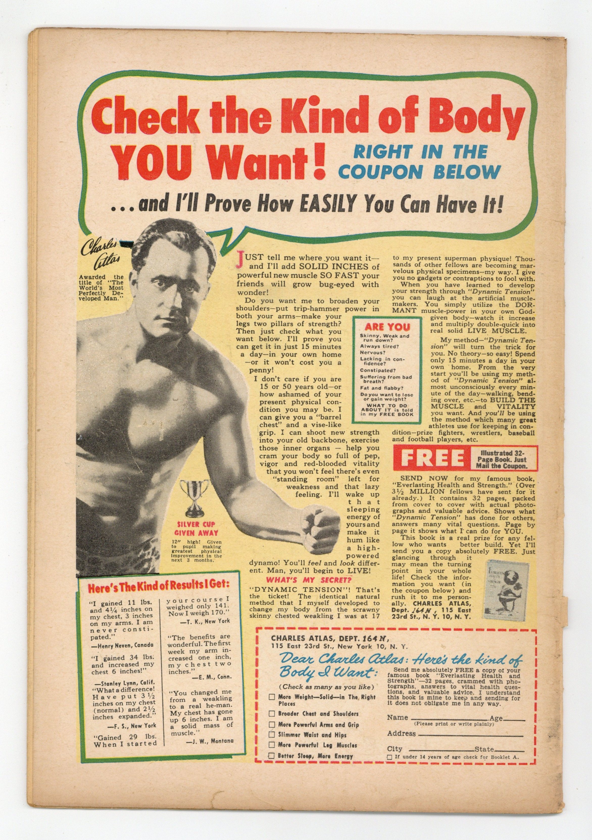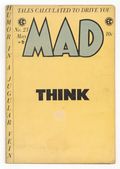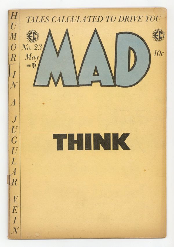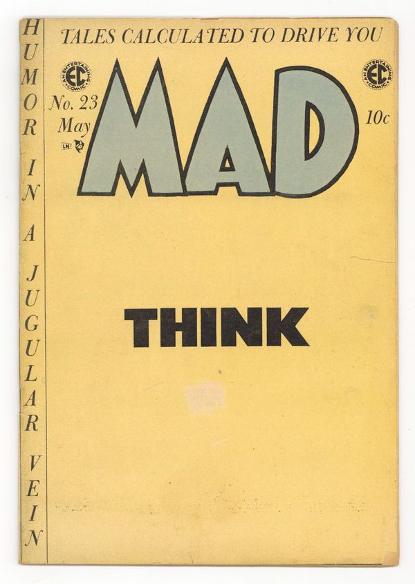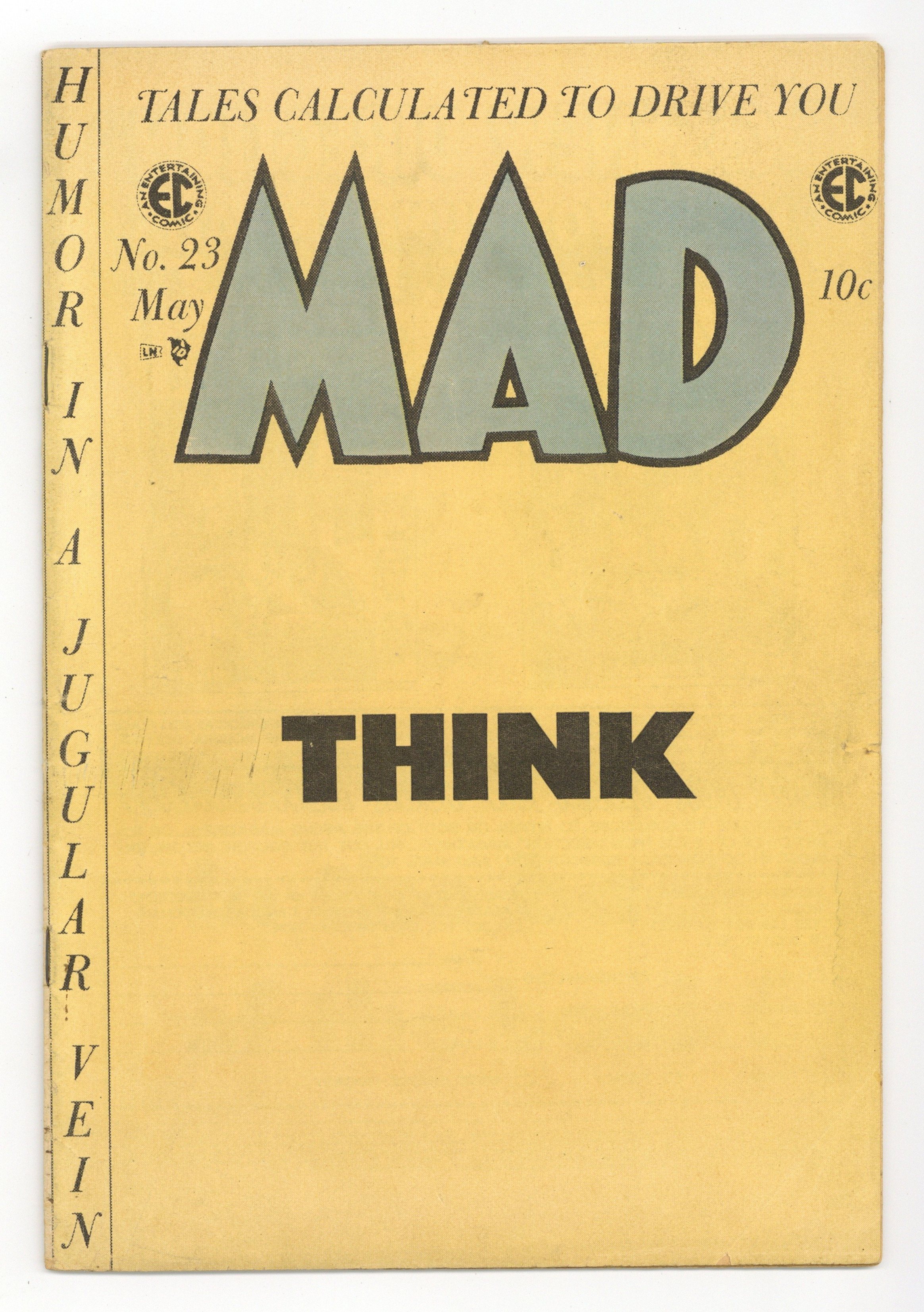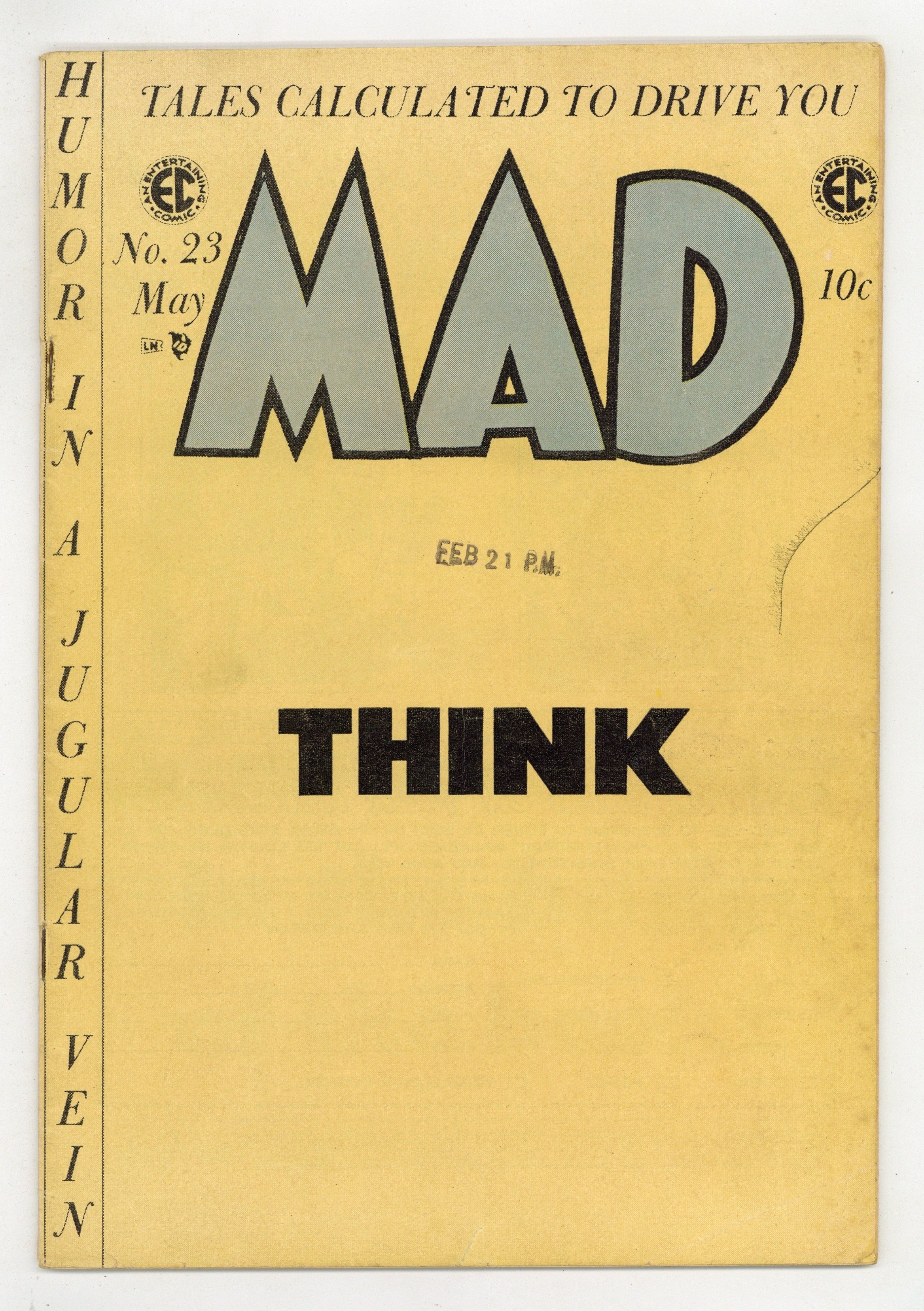 Final issue as a color comic book. Ad for MD and Psychoanalysis magazines. "Gopo Gossum!", art by Wally Wood; Gopo mistakenly leads the swamp dwellers into politics and disaster; Parody of Pogo comic strip. "Scenes We'd... Like To See!", art by Jack Davis; Typical climax scenes from various movie genres, with untypical endings. "Ripup's Believe It Or Don't," art by Wally Wood; Parody of Ripley's Believe It Or Not strips. "The Barefoot Nocountessa!", art by Jack Davis; Harry narrates the story of the Nocountessa, as she marries a series of rich men; Parody of movie The Barefoot Countessa. Announcement that MAD will change to a magazine-sized book with #24 within 3 months. Text cover. 36 pgs., full color. $0.10. Cover price $0.10.