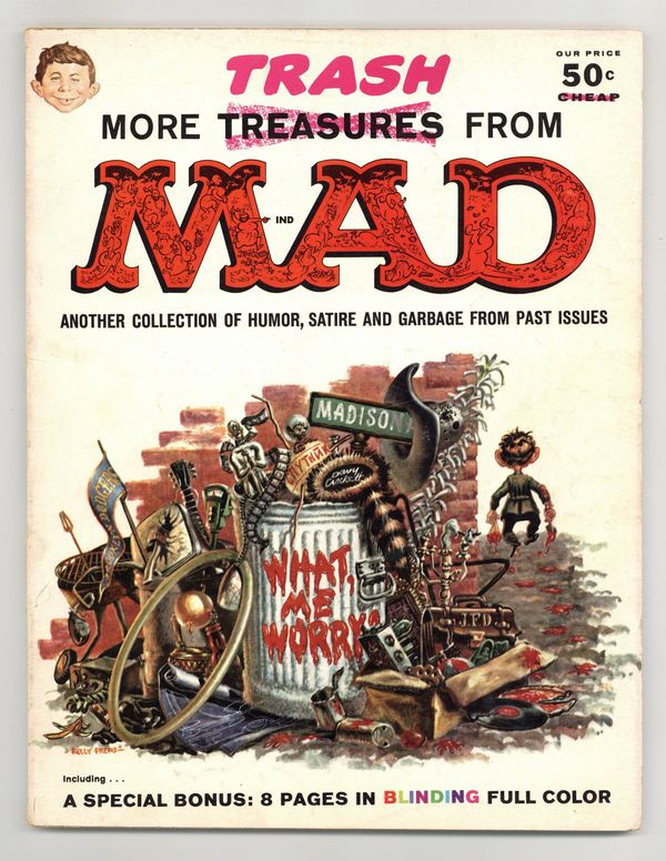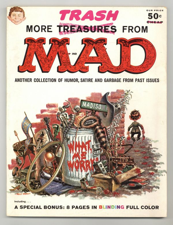 COMPLETE WITH BONUS: 8-pg. color insert/reprint from Mad comic #20. Reprints. Painted cover art by Kelly Freas. "I Don't Want To Be A King," art by Kelly Freas; Phony ad for Kings Man liquors. "Gunsmoked," art by Jack Davis; Parody of TV show "Gunsmoke." "A Collection of Daily Strips," art by Bill Elder; parodies of popular comic strips. "The Race Is On For The Super Guided Missile," script by Al Jaffee, art by Al Jaffee, Jack Davis, and Wally Wood; Shows various parts of the space race between the US and USSR, with ultimate consequences of missile use. "Future TV Ad," script and art by Don Martin; Phony ad storyboard for Schveppes Activated Sparkling Seltzer. "Orson Bean's The Two Chinese Fellas Who Go To An American Restaurant Routine," script by Orson Bean, art by Wally Wood; Illustrated comedy routine that reverses cliches about Chinese restaurants and people. "Field & Scream," art by Jack Davis; Excerpts from hunters' magazine, including some phony ads. "Kovacs' Strangely Believe It!", script by Ernie Kovacs, art by Wally Wood; Parody of "Ripley's Believe It Or Not!" "The Truth About Cowboys," script by Henry Morgan, art by Wally Wood; Discussion of historically accurate cowboys. "New Designs In Television Sets," art by Jack Davis. "MAD Establishes An...Old Comic-Strip Characters' Home," art by Wally Wood. "The Steve Allan Story," art by Bob Clarke; Parody of TV's Steve Allen Show. "Mr. Science," art by Mort Drucker; Mr. Science performs a simple experiment with a light bulb and nearly burns down the studio. "Modern Furniture," art by Dave Berg. "Katchandhammer Kids!", script by Harvey Kurtzman, art by Will Elder; A parody of the Katzenjammer Kids comic strip. "The Night People" vs. "Creeping Meatballism", script by Jean Shepherd, art by Wally Wood. "Wrestling," art by Jack Davis; A humorous look at professional wrestling matches, using all the stereotypes in the sport. "Free Fall Ferris," script by Jerry DeFuccio, art by Wallace Wood; Story about a mouse who becomes a U.S. astronaut. "Wedding Album," art by Wally Wood (as Wally Balloo); Typical wedding pictures contrasted with pictures of the same couple six months later. 108 pgs., B&W. Cover price $0.50.